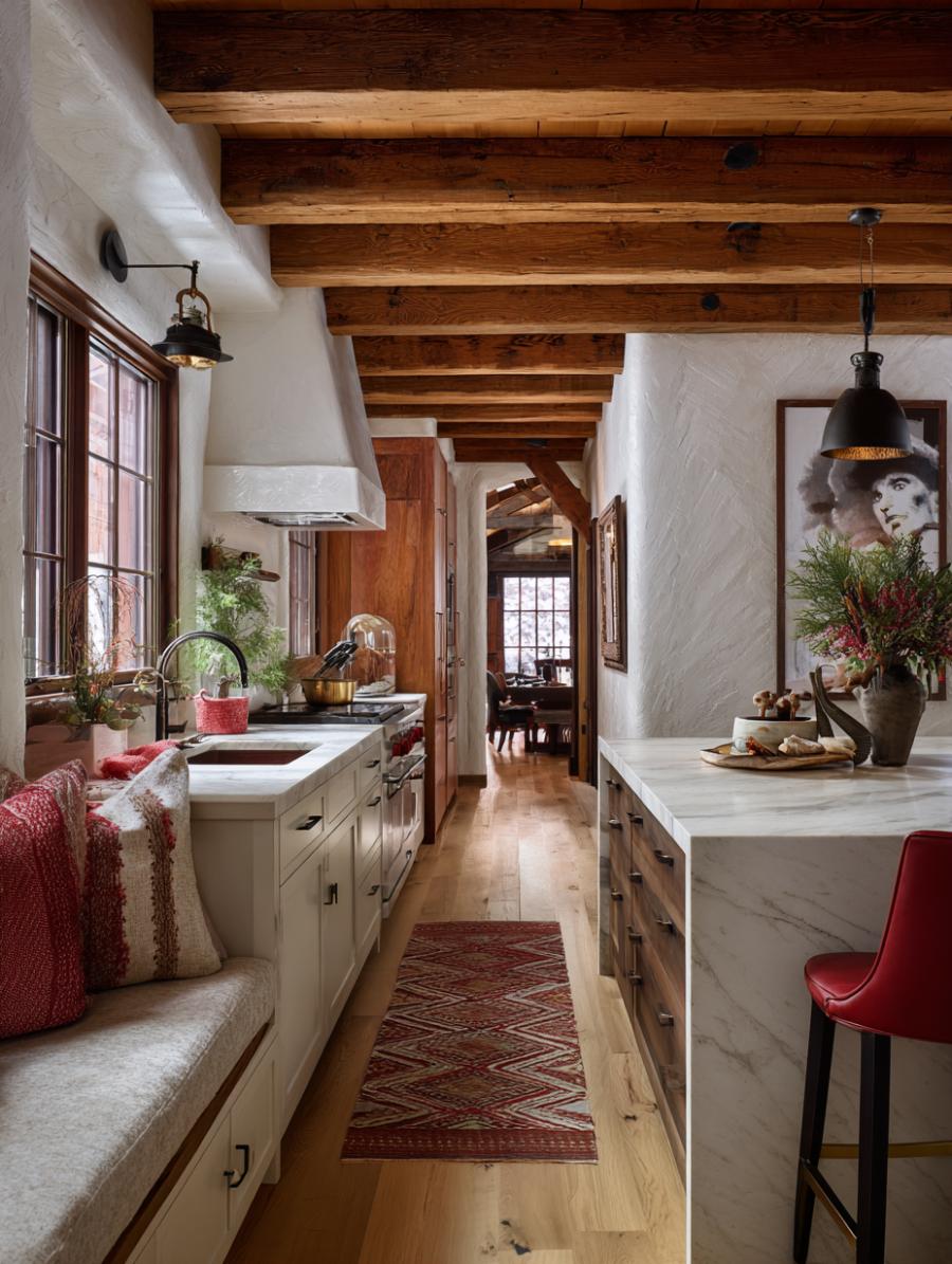 This Alpine rustic kitchen showcases a narrow white stone island paired with warm wood cabinetry and soft natural textures. The compact galley layout feels cozy and refined, echoing the atmosphere of a mountain chalet. Subtle lighting adds depth and warmth, proving that small kitchens can deliver a luxurious and inviting alpine aesthetic.