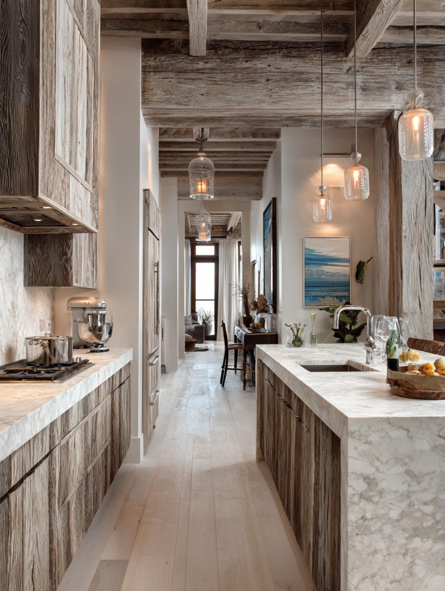 This small coastal rustic galley kitchen uses driftwood cabinetry and pale stone finishes to create a light, breezy atmosphere perfect for compact spaces. The soft palette keeps the room feeling open, while subtle textures add warmth and depth. Strategic lighting enhances the airy coastal vibe, proving that even tiny kitchens can feel uplifting, stylish, and beautifully detailed.