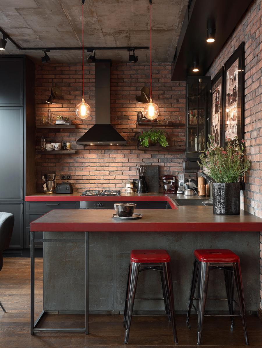 This variation of the rustic industrial theme highlights warm-toned brickwork and streamlined cabinetry, giving the tight galley layout a strong, grounded feel. Dark metal accents deepen the industrial aesthetic, while warm lighting softens the edges. Despite its small size, the kitchen feels robust, stylish, and full of character thanks to its rich material palette.
