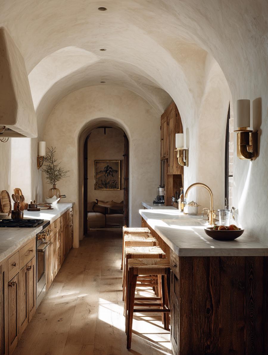 This refined rustic galley kitchen emphasizes sculpted marble details and warm wooden tones that soften the compact layout. The narrow island adds sophistication and practicality, enhancing the space without crowding it. An interplay of natural textures creates a harmonious atmosphere, making the kitchen feel luxurious, intimate, and meticulously designed.