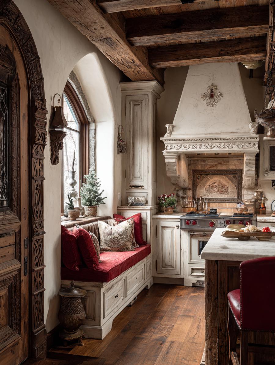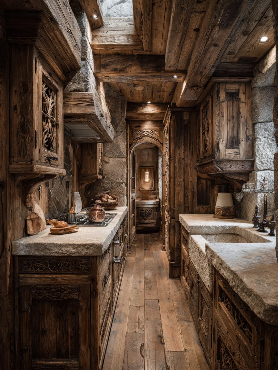 This petite rustic kitchen showcases exquisitely carved timber cabinetry that brings artistic craftsmanship into a narrow galley footprint. Warm tones and gentle lighting make the space feel inviting, while thoughtfully placed details elevate its luxury. The compact layout emphasizes functionality without sacrificing style, creating a kitchen that feels intimate, charming, and beautifully handcrafted.