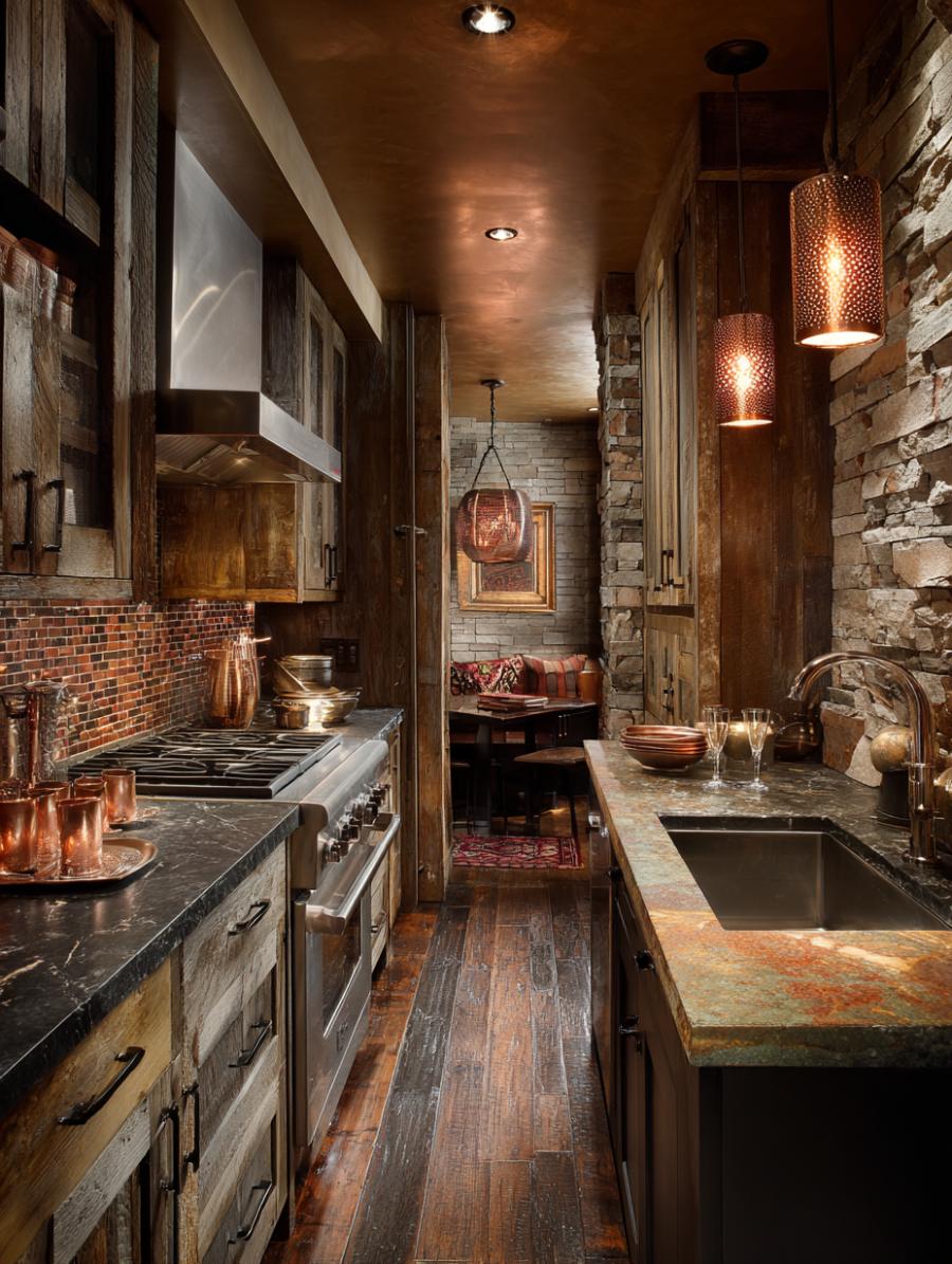 This rustic galley kitchen showcases reclaimed wood cabinetry and stone surfaces that bring rich texture to the compact space. The natural materials create a warm, grounded feeling, while thoughtful lighting adds depth. The narrow layout is elevated by quality craftsmanship, making the kitchen feel both cozy and impressively refined.
