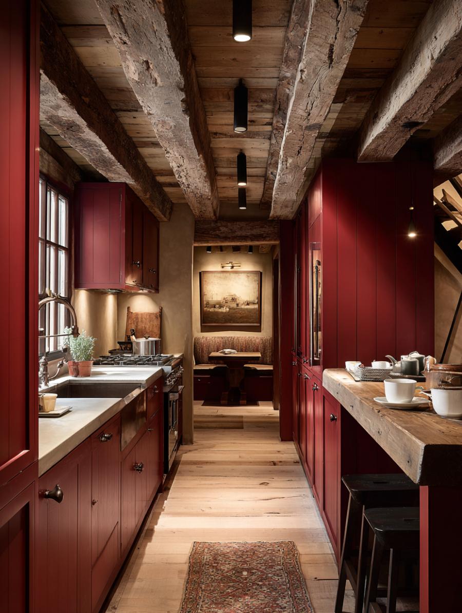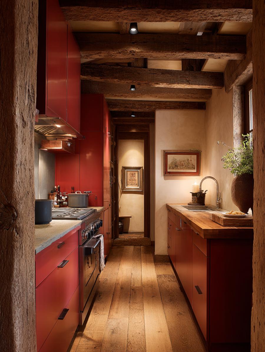 This variation builds on the rustic red palette with warm wood tones that soften the bold cabinetry. The narrow space feels cohesive and inviting, thanks to balanced textures and gentle lighting. The result is a compact kitchen with strong visual identity—rustic at heart but modern in its confident color use and refined finishes.