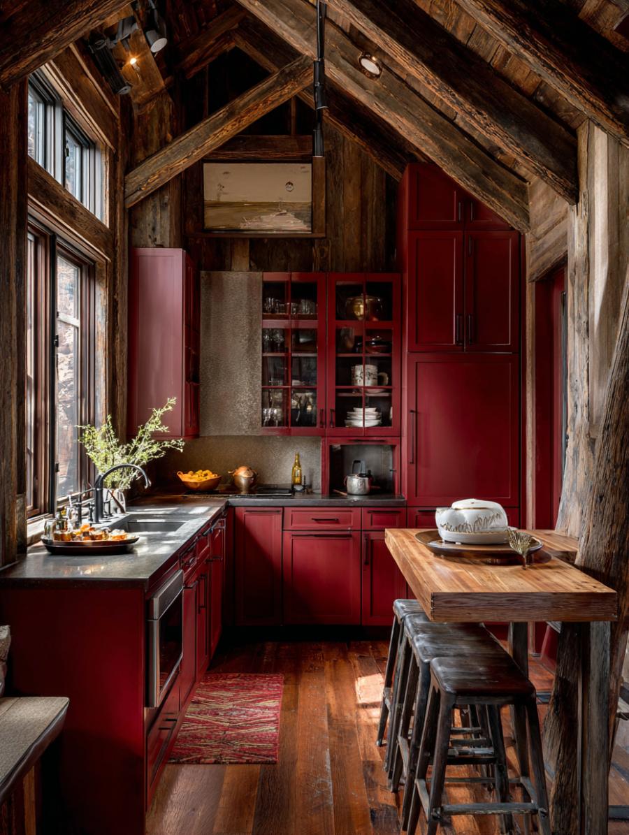 This tiny rustic galley kitchen makes a bold statement with matte red cabinetry balanced by warm wood and subtle stone textures. The narrow layout feels energized by the color choice, while soft lighting prevents the space from feeling heavy. Every detail adds personality, creating a compact kitchen that feels vibrant, stylish, and unexpectedly luxurious.