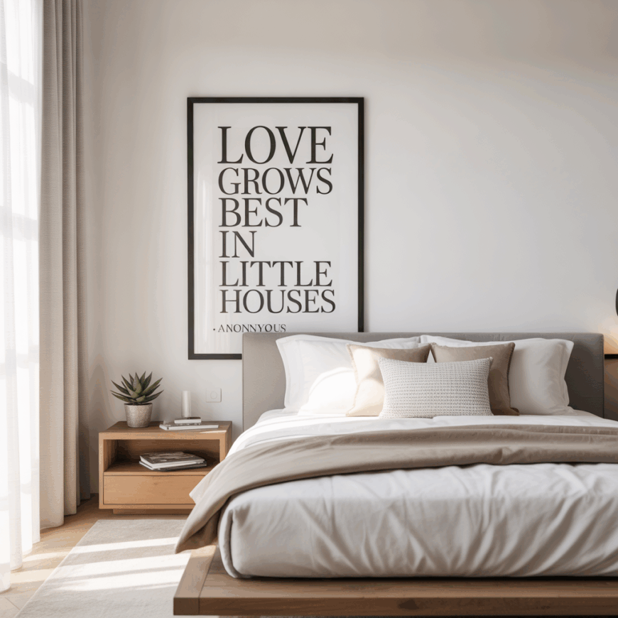 This charming wall quote decor reveals your belief that intimacy thrives in cozy spaces. You understand that love isn’t about grand gestures or expensive homes.