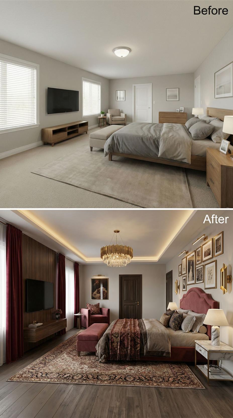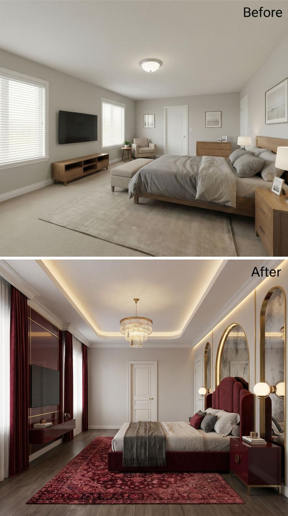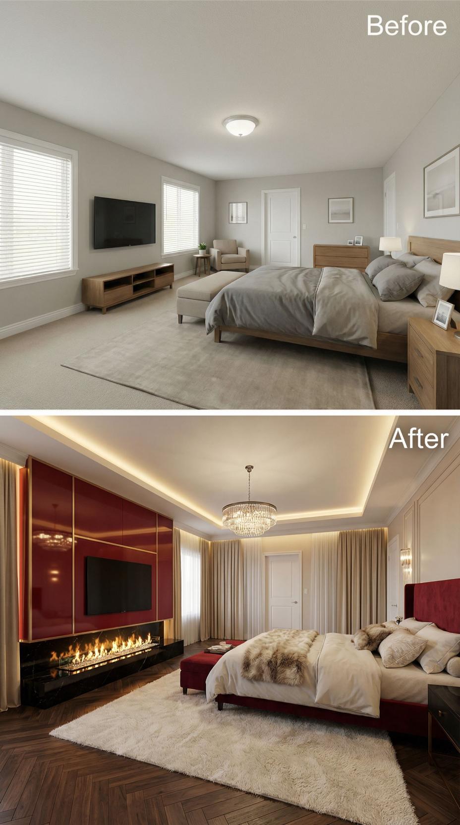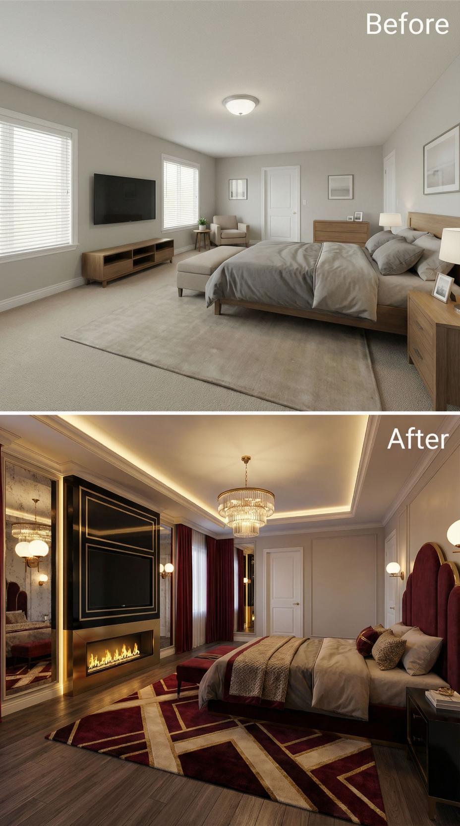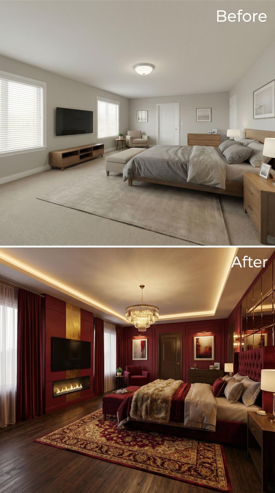 Dramatic burgundy walls replace bland beige tones in this stunning bedroom makeover. Gold leaf accents and warm LED ceiling lighting create an intimate ambiance, while the linear fireplace adds luxury to the original builder grade layout. Rich velvet textures, ornate Persian rugs, and crystal chandeliers transform the space into an opulent retreat that rivals high-end hotel suites.
