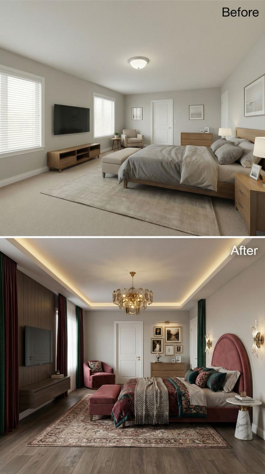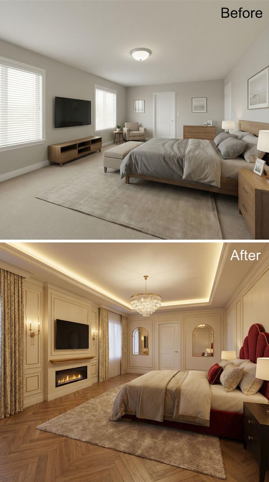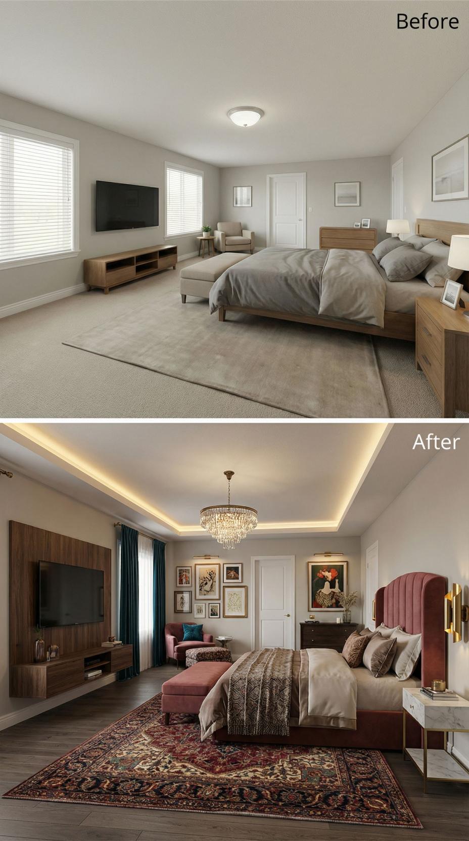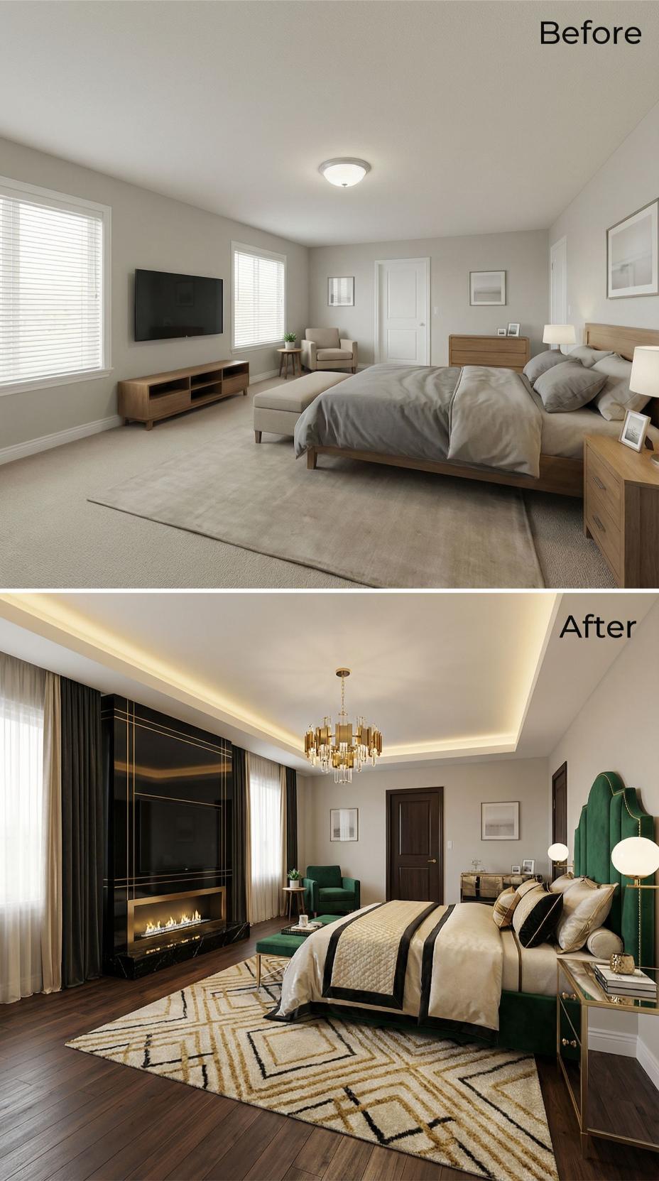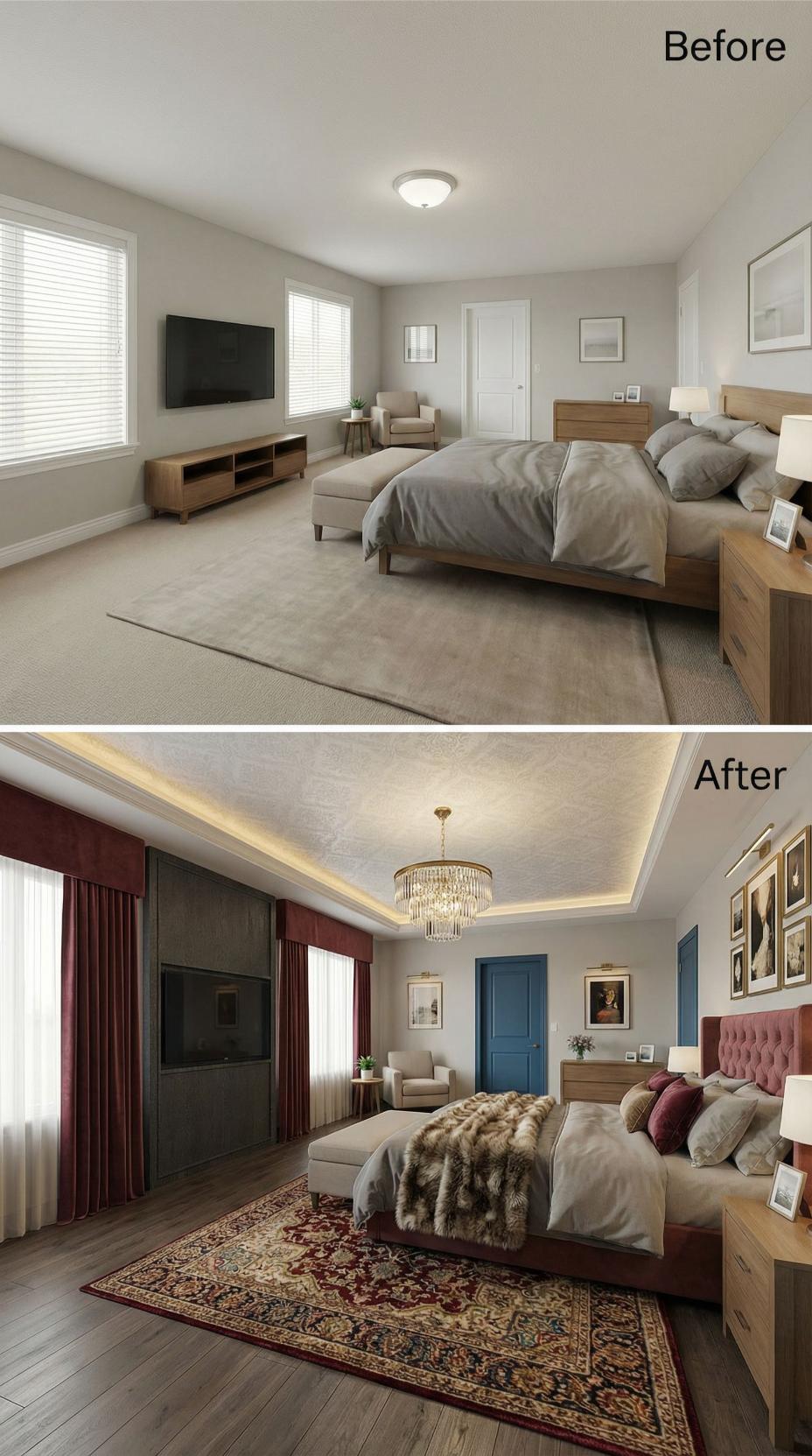 Dramatic burgundy walls replace bland beige tones in this stunning bedroom makeover. Gold leaf accents and warm LED ceiling lighting create an intimate ambiance, while the linear fireplace adds luxury to the original builder grade layout. Rich velvet textures, ornate Persian rugs, and crystal chandeliers transform the space into an opulent retreat that rivals high-end hotel suites.