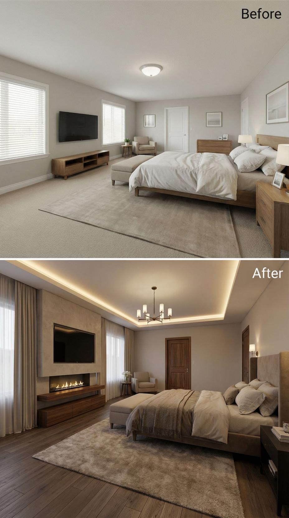 Cove lighting transforms this builder grade bedroom into a sophisticated sanctuary with dramatic architectural interest. Rich walnut built-ins replace basic furniture while a sleek linear fireplace anchors the entertainment wall. Floor-to-ceiling curtains in warm taupe elevate the windows, complemented by layered neutral bedding and a statement modern chandelier that replaces the original flush-mount fixture.