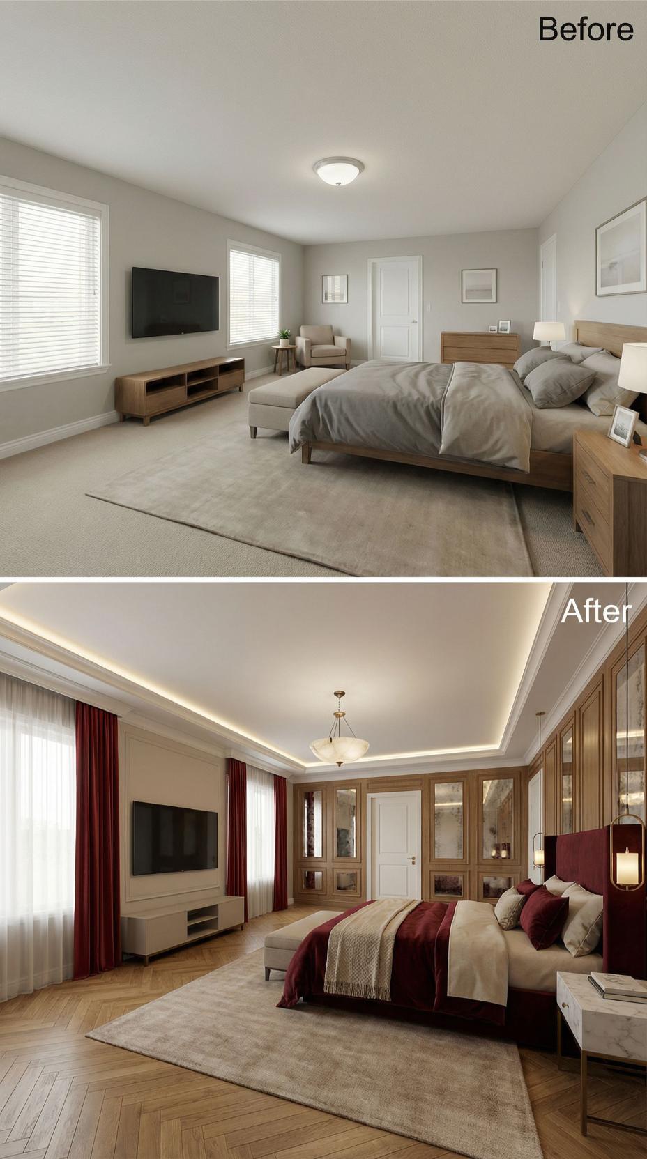 Rich burgundy velvet transforms this builder grade bedroom into a sophisticated retreat with hotel-like luxury. The renovation introduces dramatic ceiling coffers with warm LED lighting, replacing basic overhead fixtures with an elegant crystal chandelier. Deep wine curtains frame the windows while ornate gold-framed mirrors and matching nightstands elevate the space from standard to spectacular glamour.