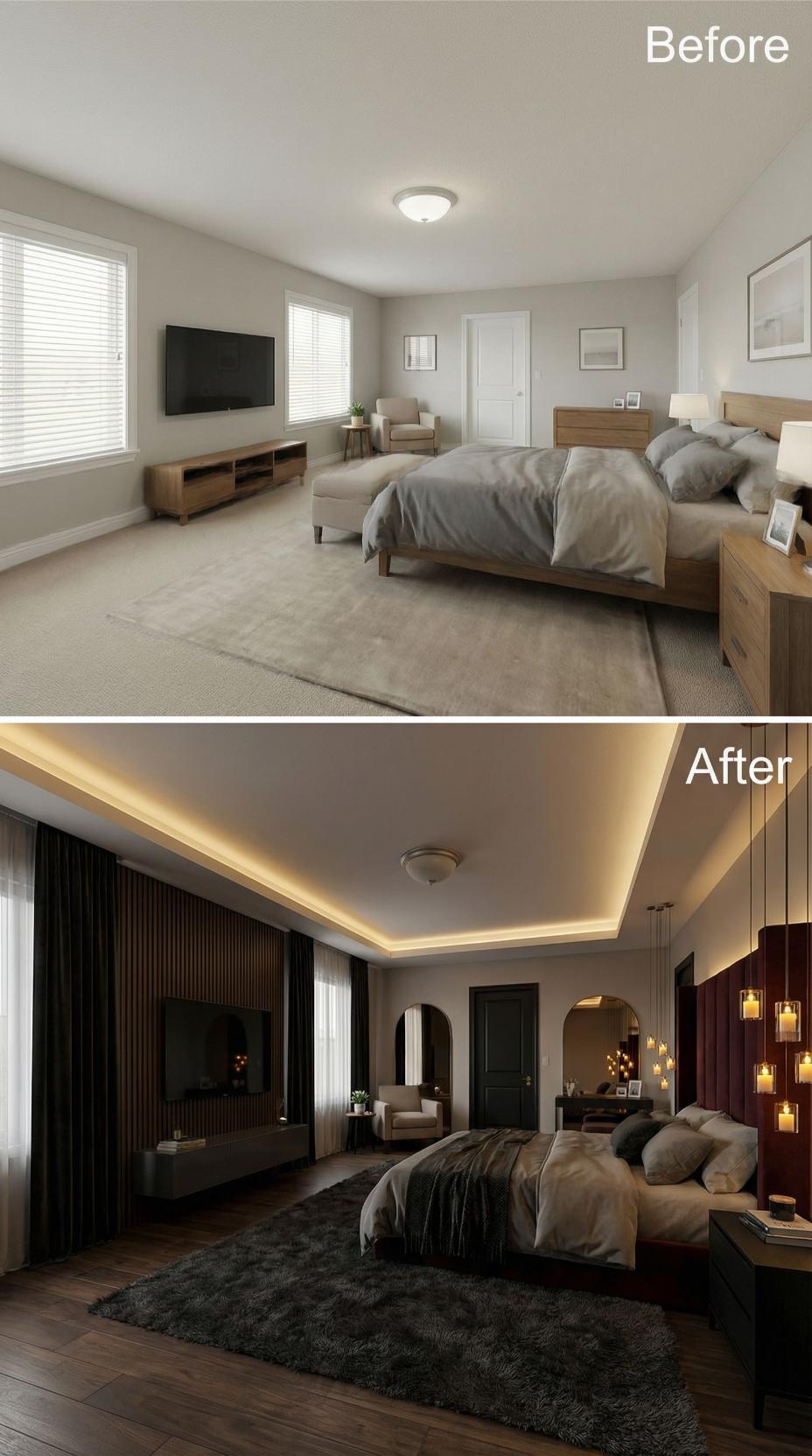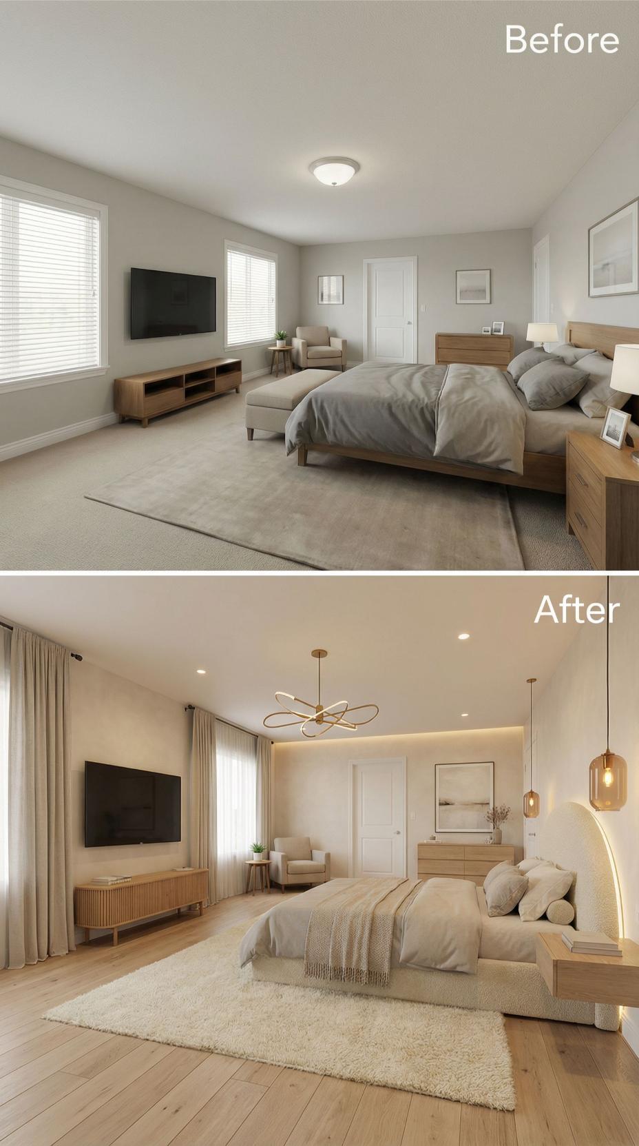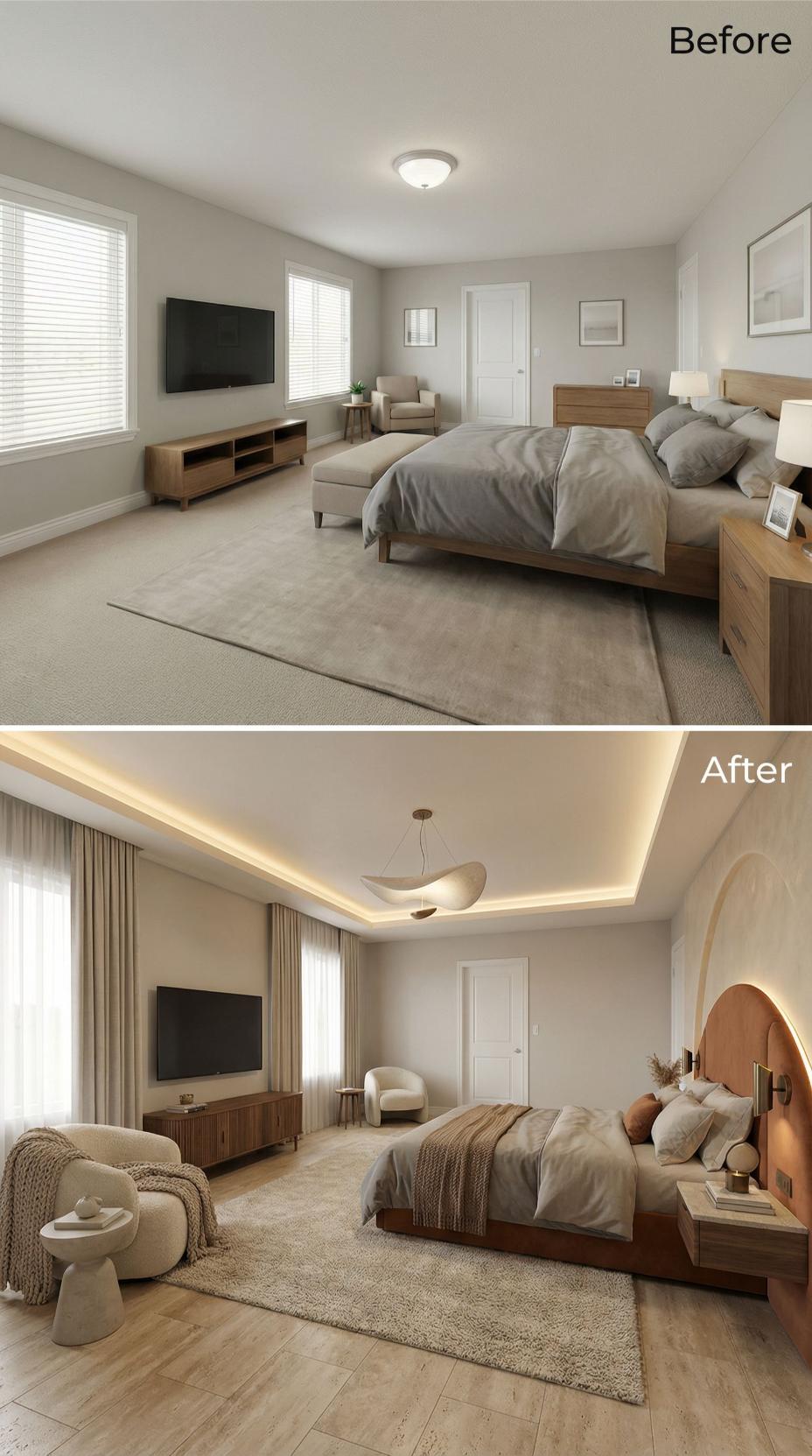 Warm wood tones and sophisticated lighting transformed this basic builder grade bedroom into an elegant sanctuary. The addition of a curved upholstered headboard, recessed ceiling lighting with warm LED strips, and rich walnut cabinetry creates visual depth. Floor-to-ceiling curtains replace simple blinds while a sculptural pendant light becomes the room’s artistic focal point, elevating the entire space.