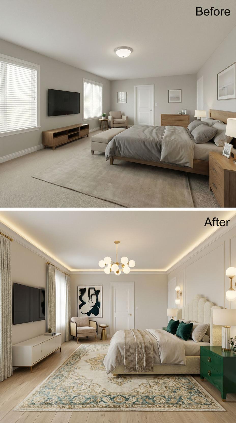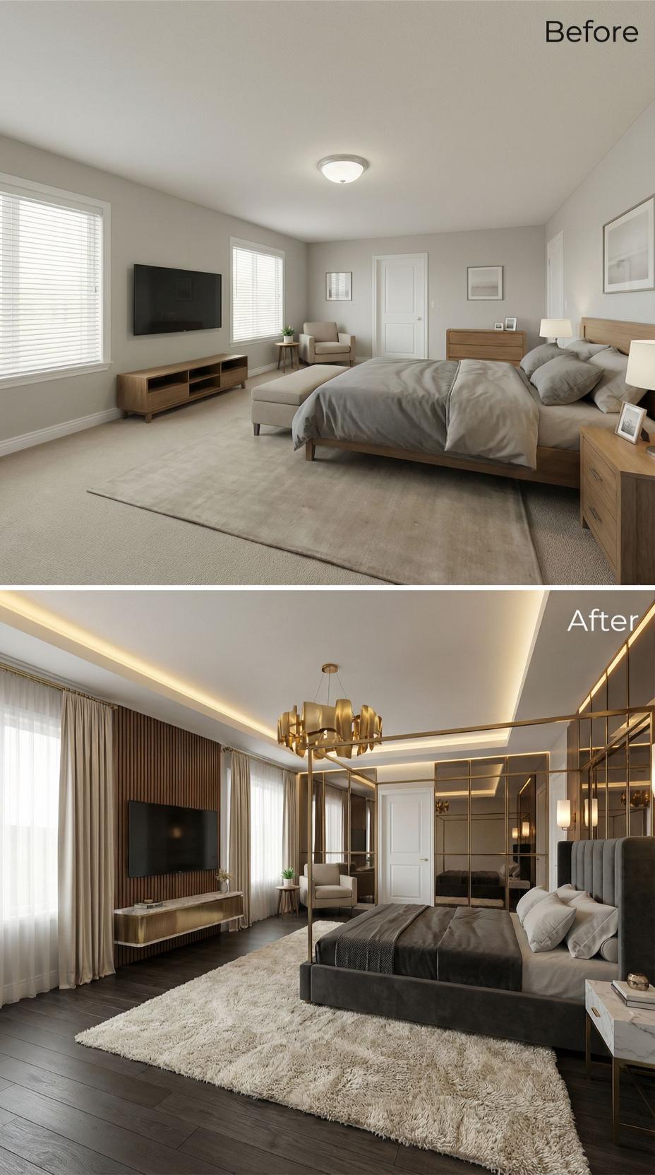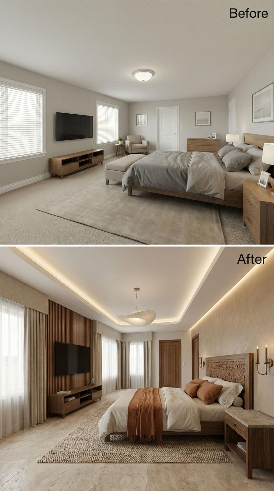 Warm wood tones and sophisticated lighting transformed this basic builder grade bedroom into an elegant sanctuary. The addition of a curved upholstered headboard, recessed ceiling lighting with warm LED strips, and rich walnut cabinetry creates visual depth. Floor-to-ceiling curtains replace simple blinds while a sculptural pendant light becomes the room’s artistic focal point, elevating the entire space.