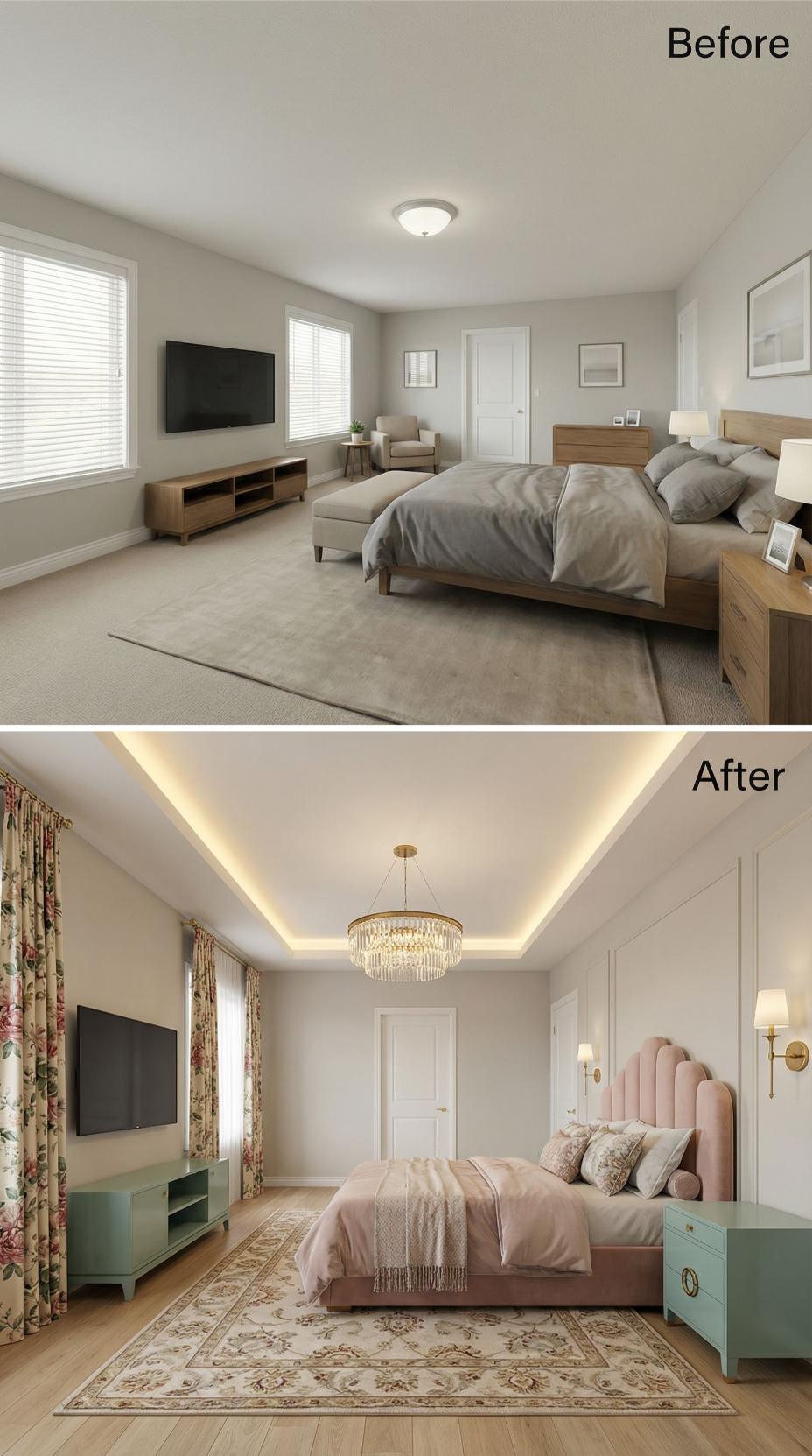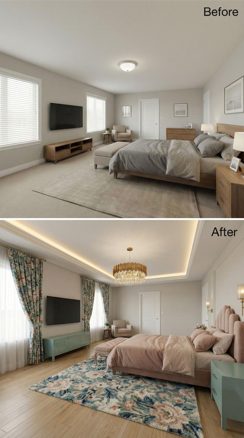 Bold transformation elevates this builder grade bedroom into an opulent retreat through stunning design upgrades. Cove lighting with warm LED strips creates dramatic ambiance, while a crystal chandelier replaces basic ceiling fixtures. Floral curtains, sage green furniture, and a scalloped blush headboard introduce personality and sophistication. The ornate patterned rug anchors the space with timeless elegance.