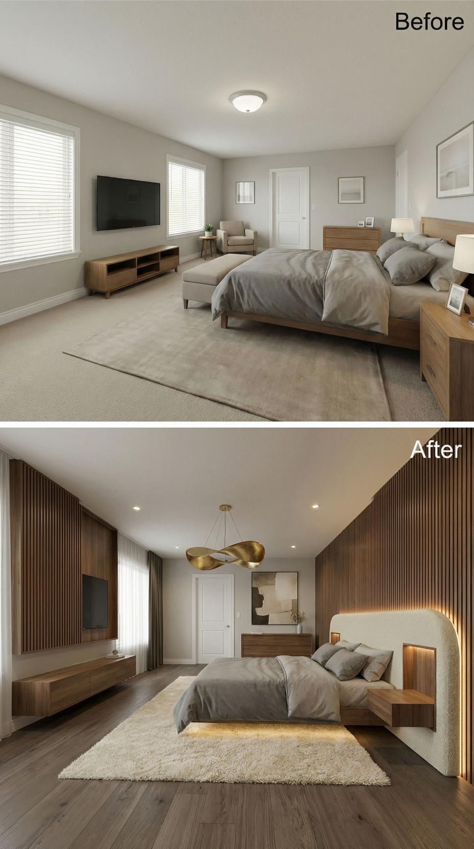Wood slat accent walls transform this builder grade bedroom into a sophisticated retreat with rich texture and warmth. The floating nightstands with integrated LED lighting create a hotel-like ambiance, while the sculptural brass pendant light serves as a stunning focal point. Dark hardwood flooring and layered neutral textiles complete the luxurious makeover from basic to breathtaking.