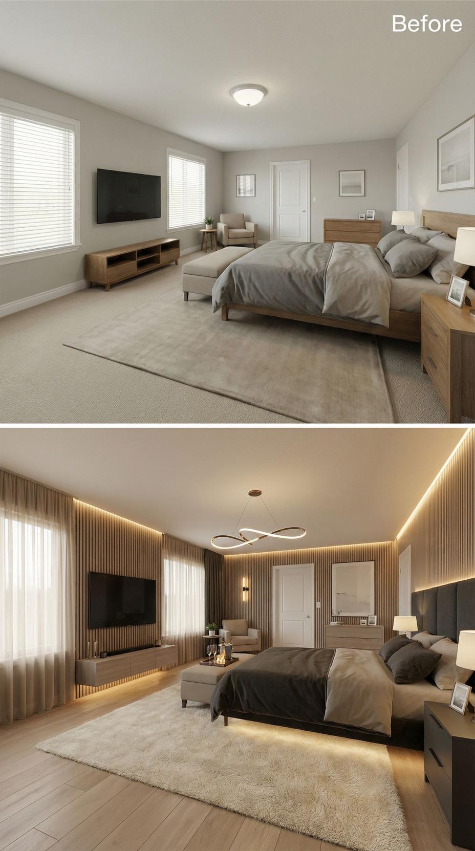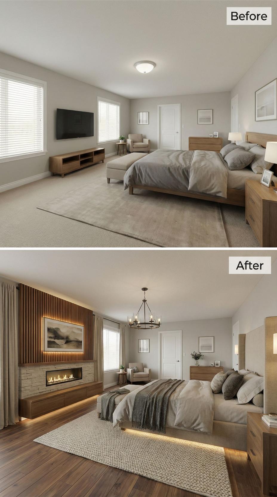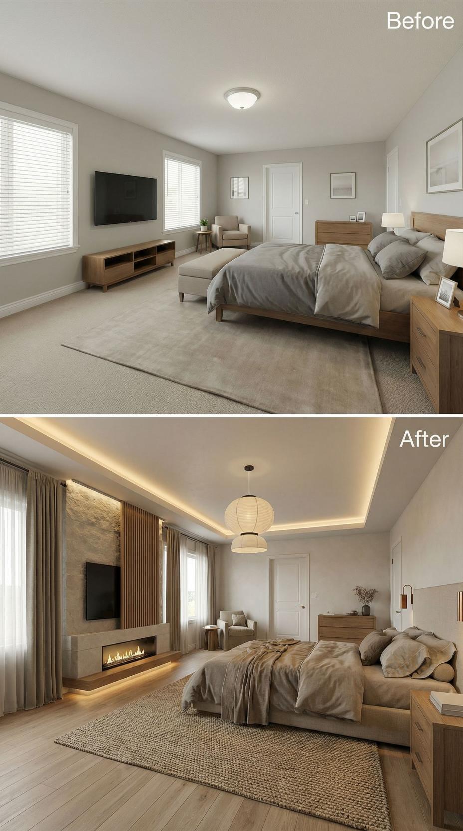 Warm wood slat paneling transforms the plain television wall into a stunning focal point, while a sleek linear fireplace adds instant sophistication below. Cove lighting creates ambient warmth around the ceiling perimeter, replacing harsh overhead fixtures. Natural jute textures ground the space through woven area rugs, while layered pendant lighting and flowing curtains elevate this once-basic bedroom into a hotel-inspired sanctuary.