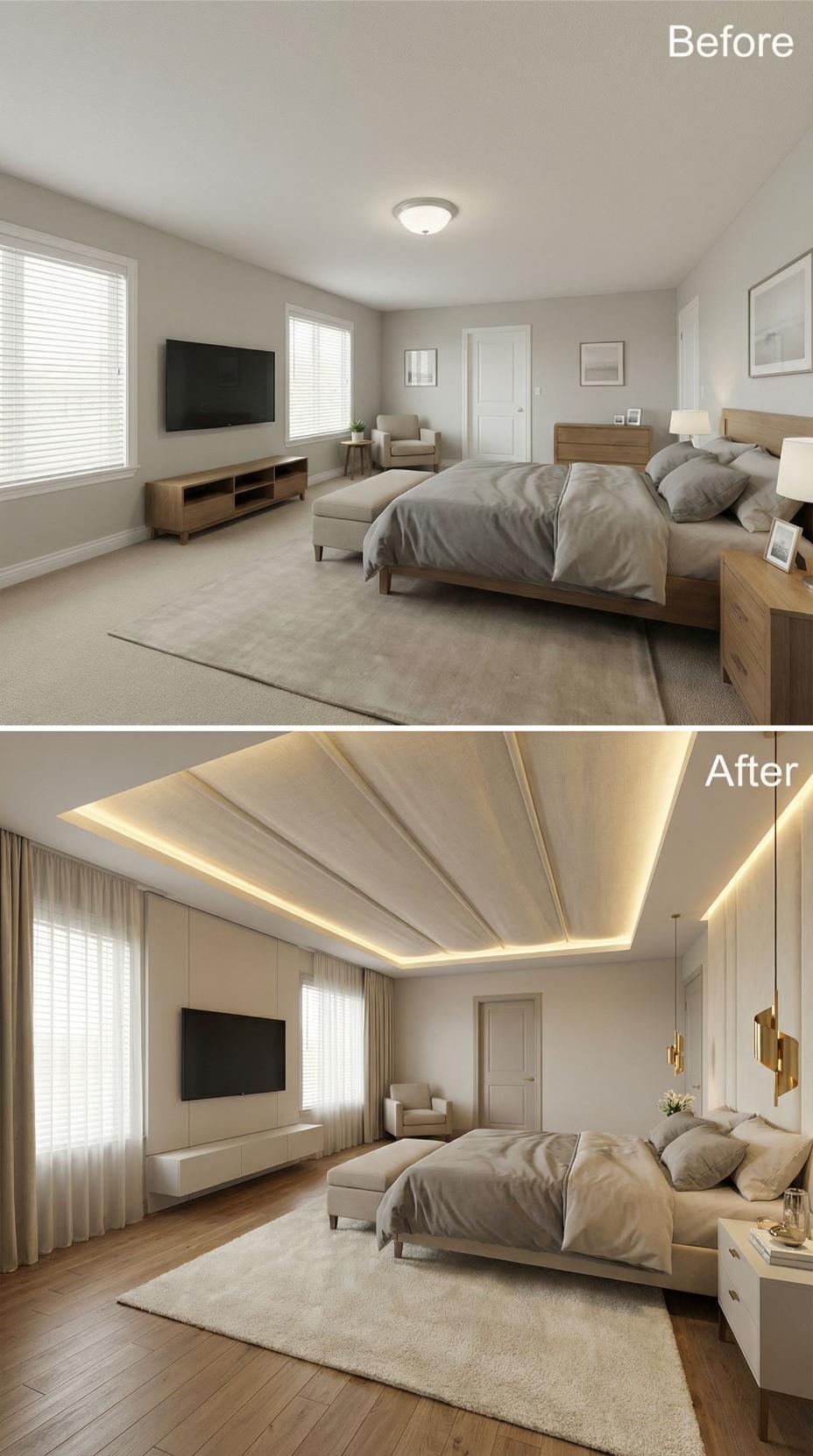 Dramatic ceiling architecture with integrated LED strip lighting transforms this builder grade bedroom into a sophisticated retreat. Warm wood flooring replaces basic carpet while floor-to-ceiling curtains add luxurious softness to previously bare windows. The custom tray ceiling design creates stunning ambient lighting that elevates the entire space from ordinary to extraordinary.