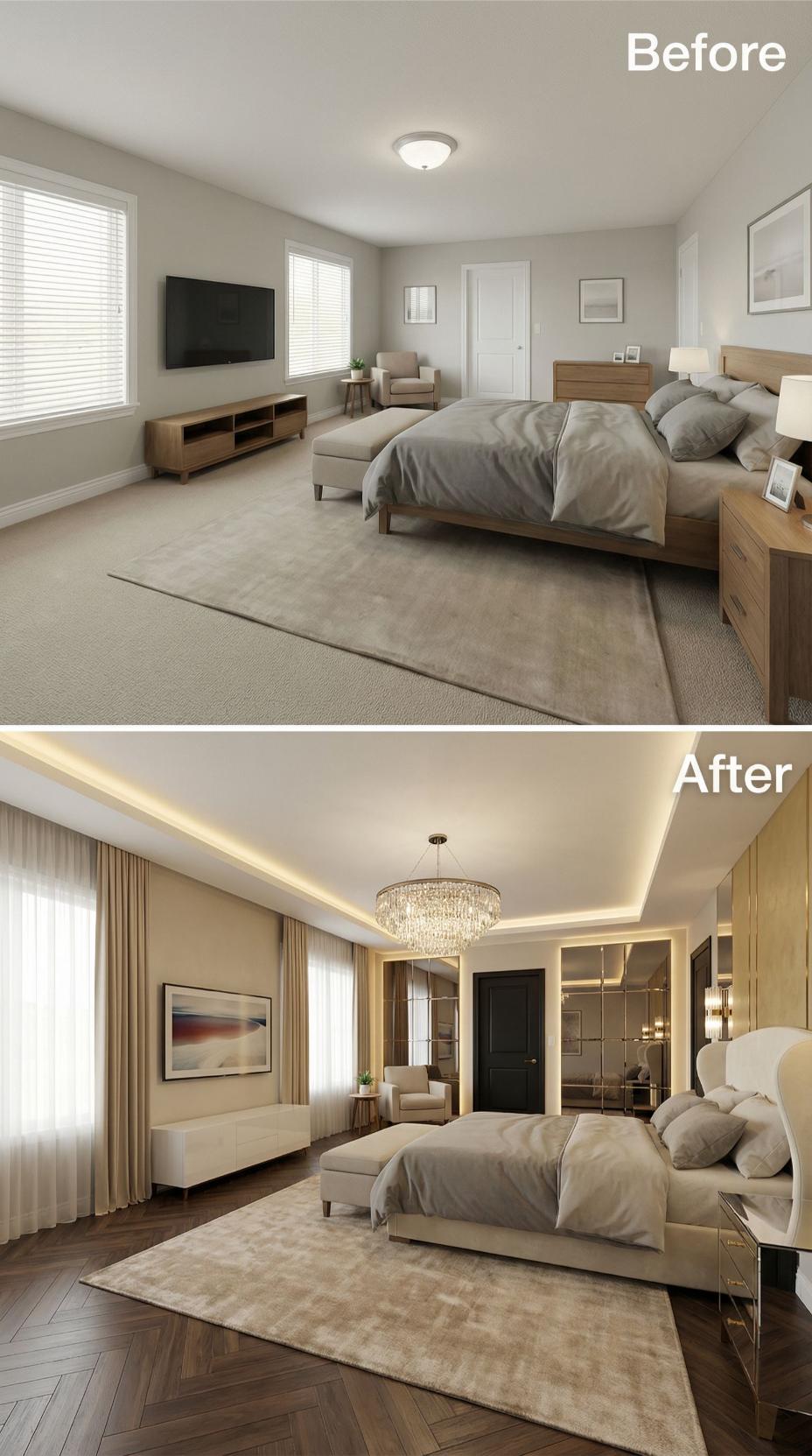 Dramatic architectural elements completely transformed this builder grade bedroom into a sophisticated retreat. Cove lighting creates ambient warmth around the perimeter ceiling, while a statement crystal chandelier replaces basic overhead lighting. Rich wood flooring and floating nightstands elevate the space, complemented by floor-to-ceiling curtains that add vertical drama and luxury hotel ambiance.