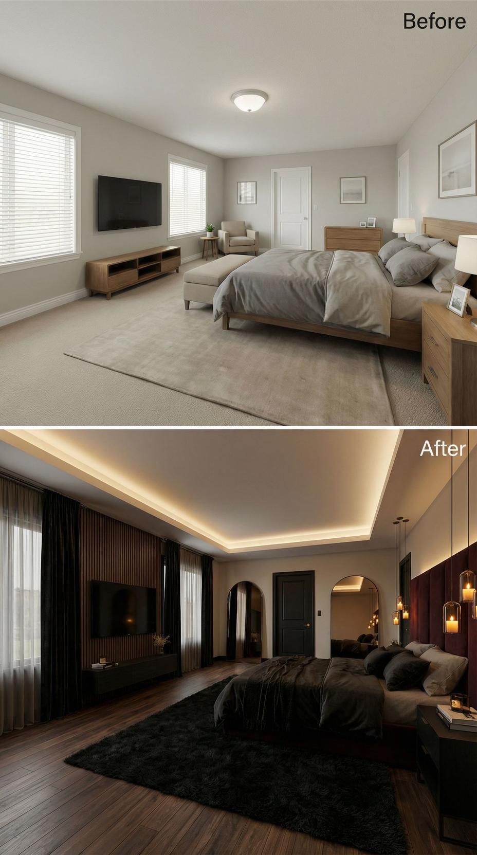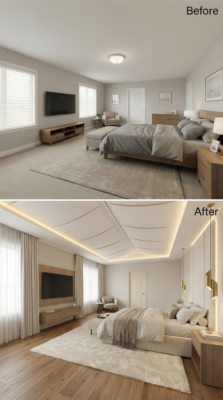 Dramatic architectural ceiling treatment with geometric coffers and warm LED lighting strips transforms this builder grade bedroom into a sophisticated retreat. Rich walnut wood flooring replaces basic carpet, while the custom TV accent wall and flowing floor-to-ceiling curtains create visual depth. Layered lighting, from recessed cove illumination to elegant brass pendant lights, establishes an inviting ambiance that elevates the entire space.