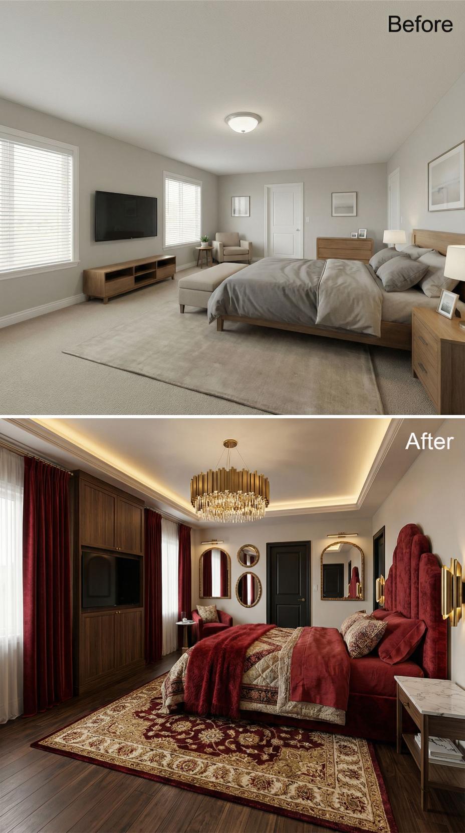 Deep burgundy velvet transforms this once-bland builder grade bedroom into a sophisticated sanctuary worthy of a luxury hotel. Rich walnut wood paneling replaces basic walls, while an ornate brass crystal chandelier commands attention overhead. Plush red bedding, decorative mirrors, and dramatic ceiling lighting create layers of opulence that elevate every surface from ordinary to extraordinary.