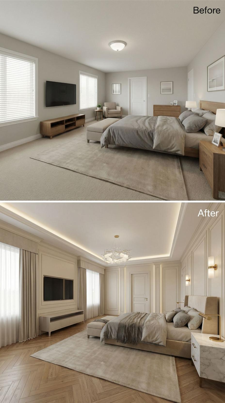 Dramatic architectural upgrades transformed this builder grade bedroom into a sophisticated sanctuary. Coffered ceilings with integrated LED lighting replaced standard flat surfaces, while custom millwork and brass sconces flanked an upholstered headboard. Rich hardwood floors, layered window treatments, and a statement drum chandelier elevated the space from basic to breathtaking luxury.