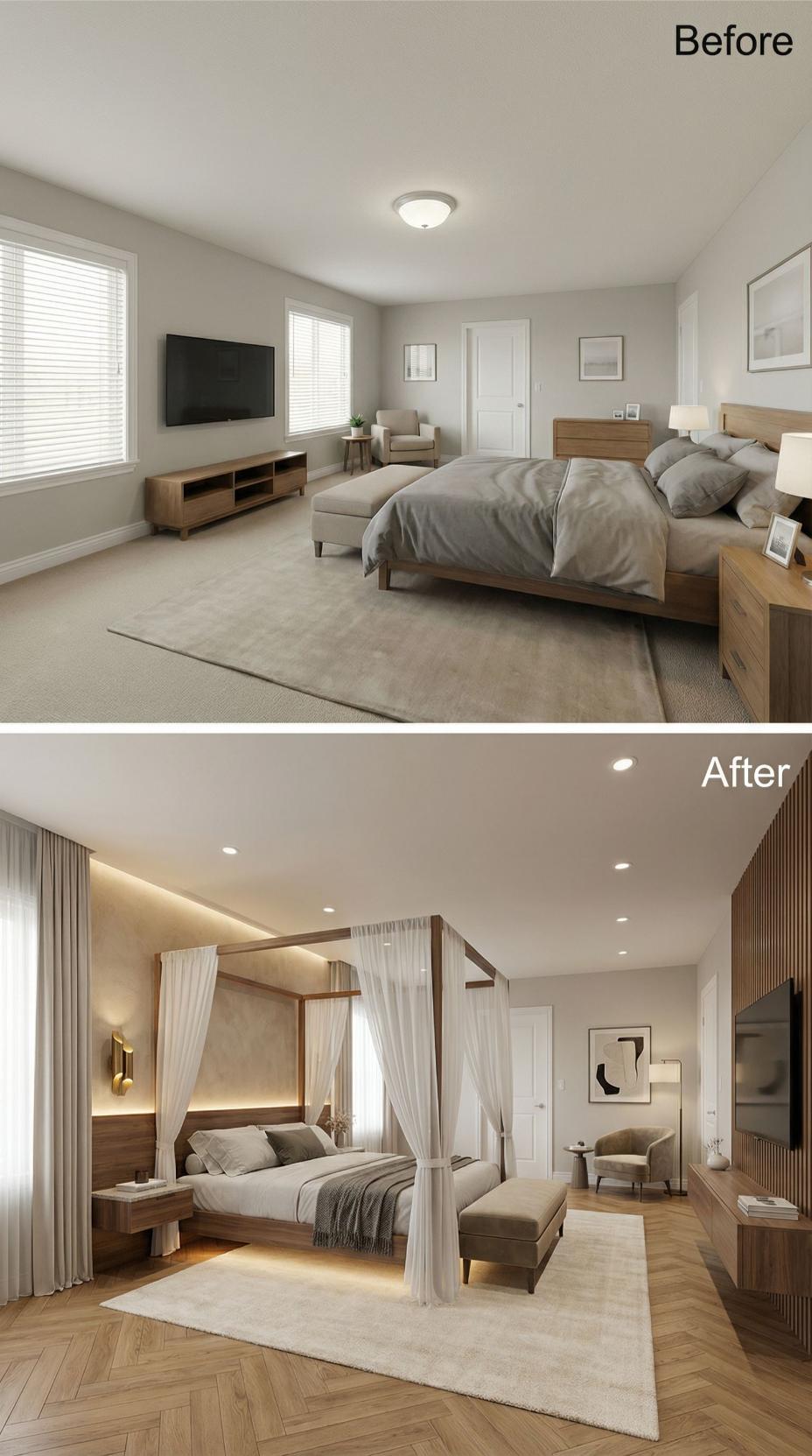 Warm walnut wood transforms this builder grade bedroom into a sophisticated retreat with a stunning four-poster canopy bed as the centerpiece. Recessed ceiling lighting with linear LED strips creates dramatic ambiance, while full-length curtains replace basic blinds for elegant window treatments. Rich wood tones throughout the media console and built-in storage elevate the space from basic to breathtakingly luxurious.