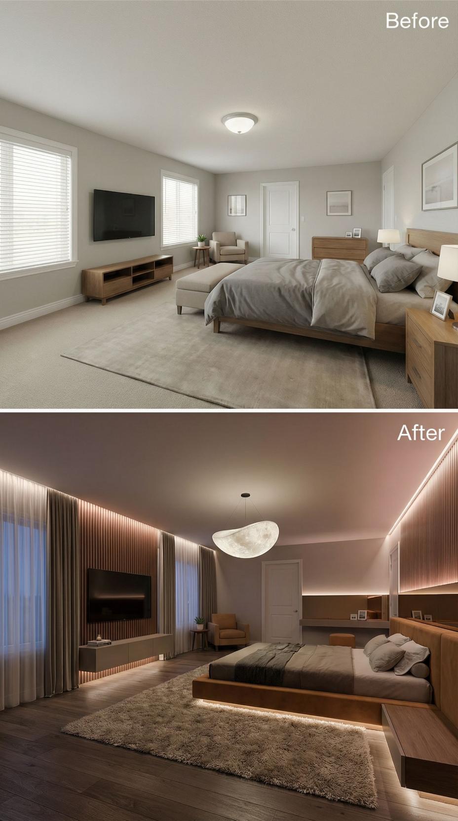 Dramatic LED strip lighting transforms this builder grade bedroom into a sophisticated retreat. Warm amber lighting creates stunning accent walls behind the platform bed and media console, while rich wooden slat paneling replaces plain drywall. Floor-to-ceiling curtains in charcoal gray add luxury and depth. The floating platform bed design with integrated lighting underneath creates an elevated, hotel-like atmosphere that’s worlds away from the original basic space.