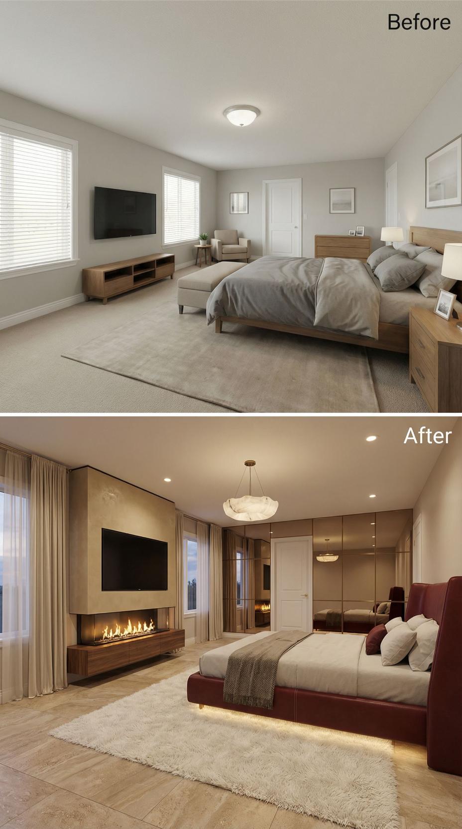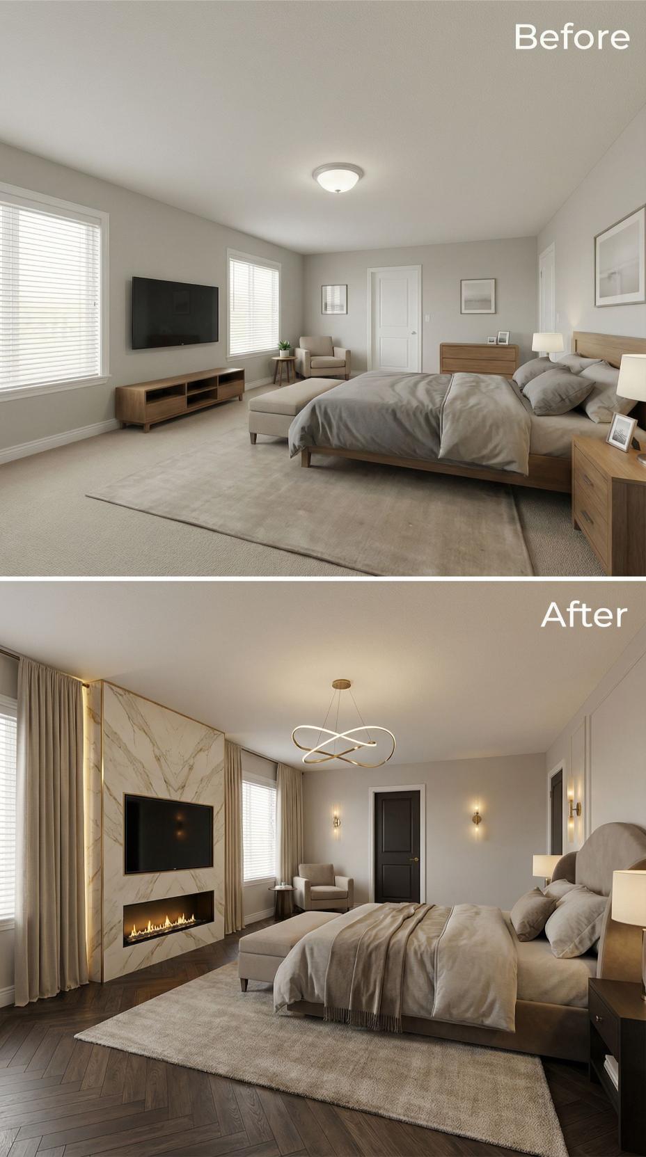 Dramatic architectural upgrades transformed this builder grade bedroom into a sophisticated retreat. The stunning marble-clad fireplace wall creates a breathtaking focal point, while rich wood flooring replaces basic carpet throughout. Modern pendant lighting, elegant curtain panels, and warm wall sconces elevate the ambiance from generic to genuinely luxurious, proving how strategic investments in key features can completely reimagine a space.