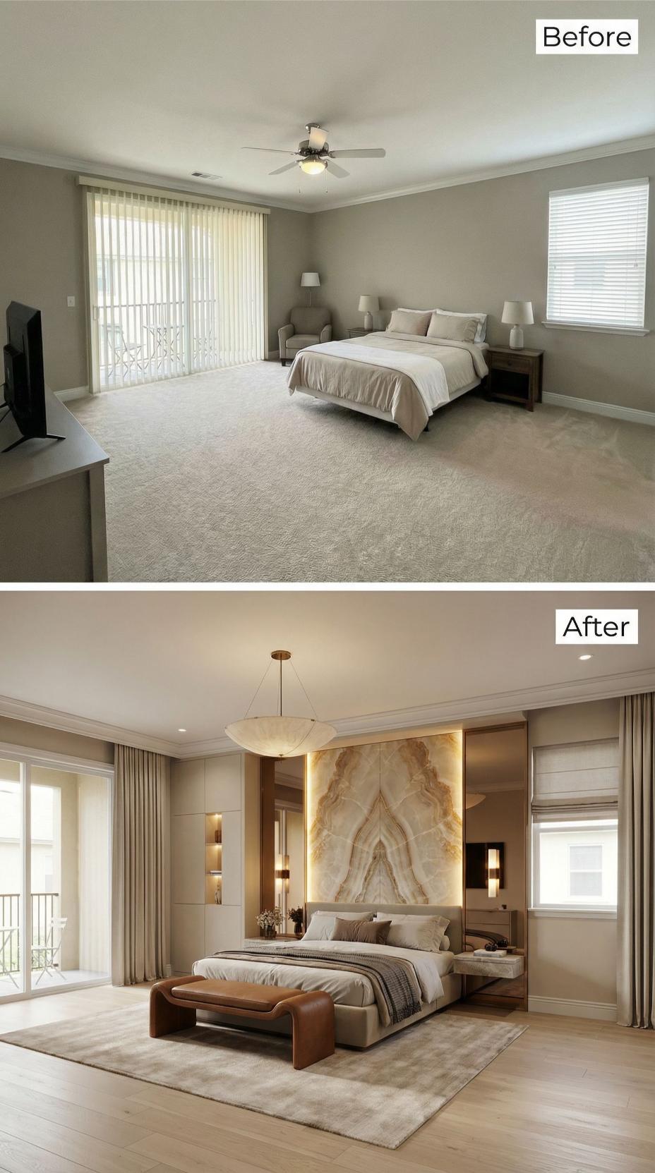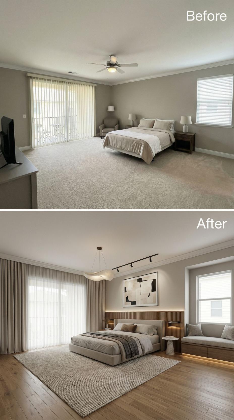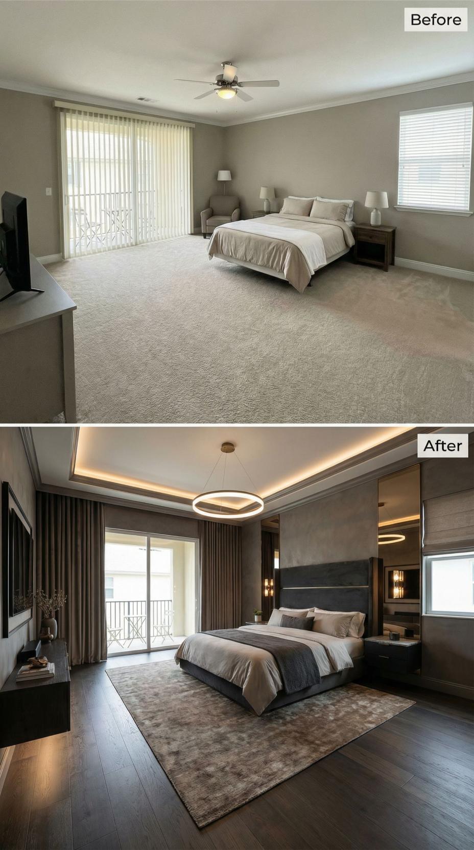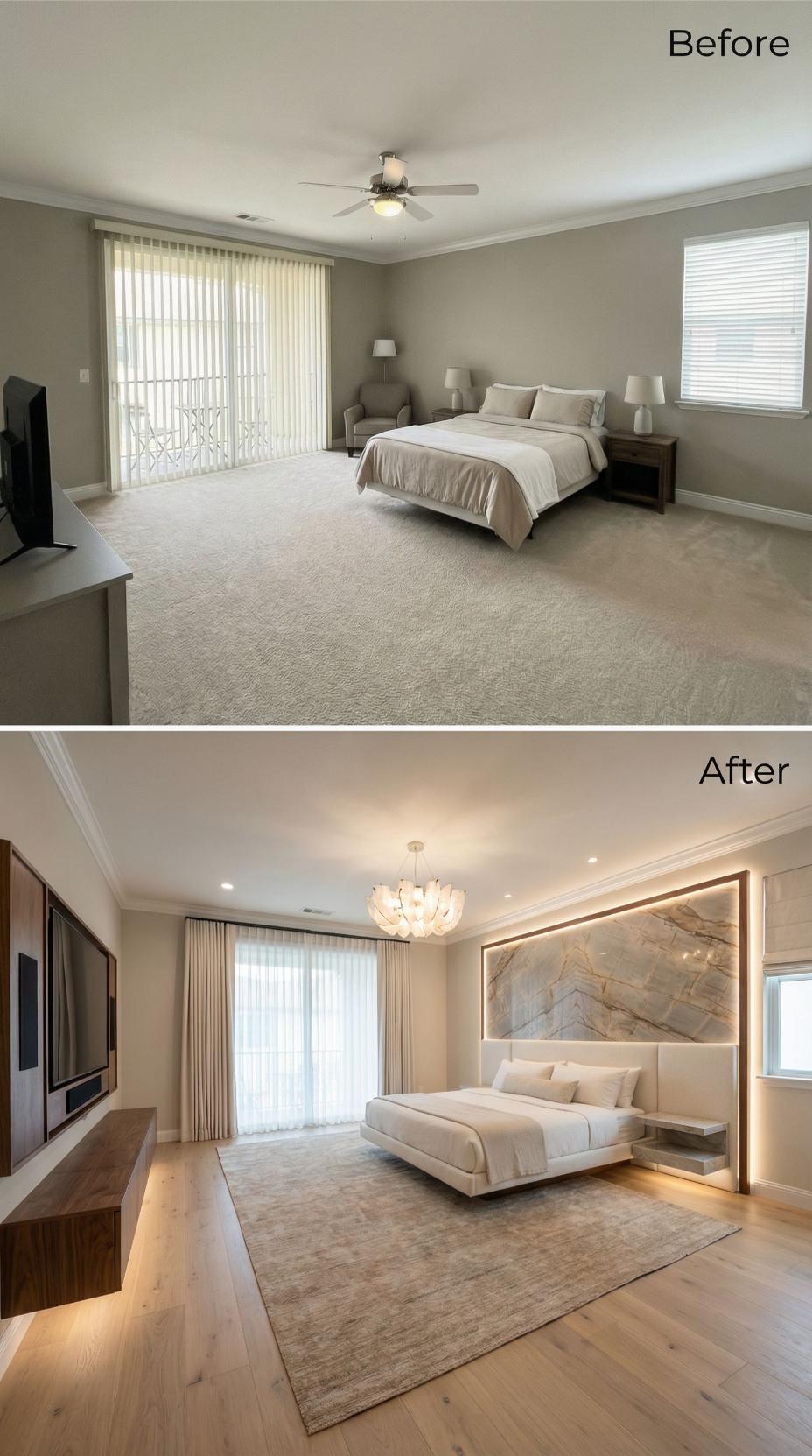 A main bedroom should feel like a landing pad, not a layover. This one arrives with the usual starter-kit calm: broad beige carpet, a ceiling fan doing its best, and furniture that politely refuses to argue with anything. Then the renovations move in. Across this gallery, the same footprint gets treated like prime real estate: bolder lighting, richer materials, smarter layouts, and headboards that behave like architecture. Welcome home.