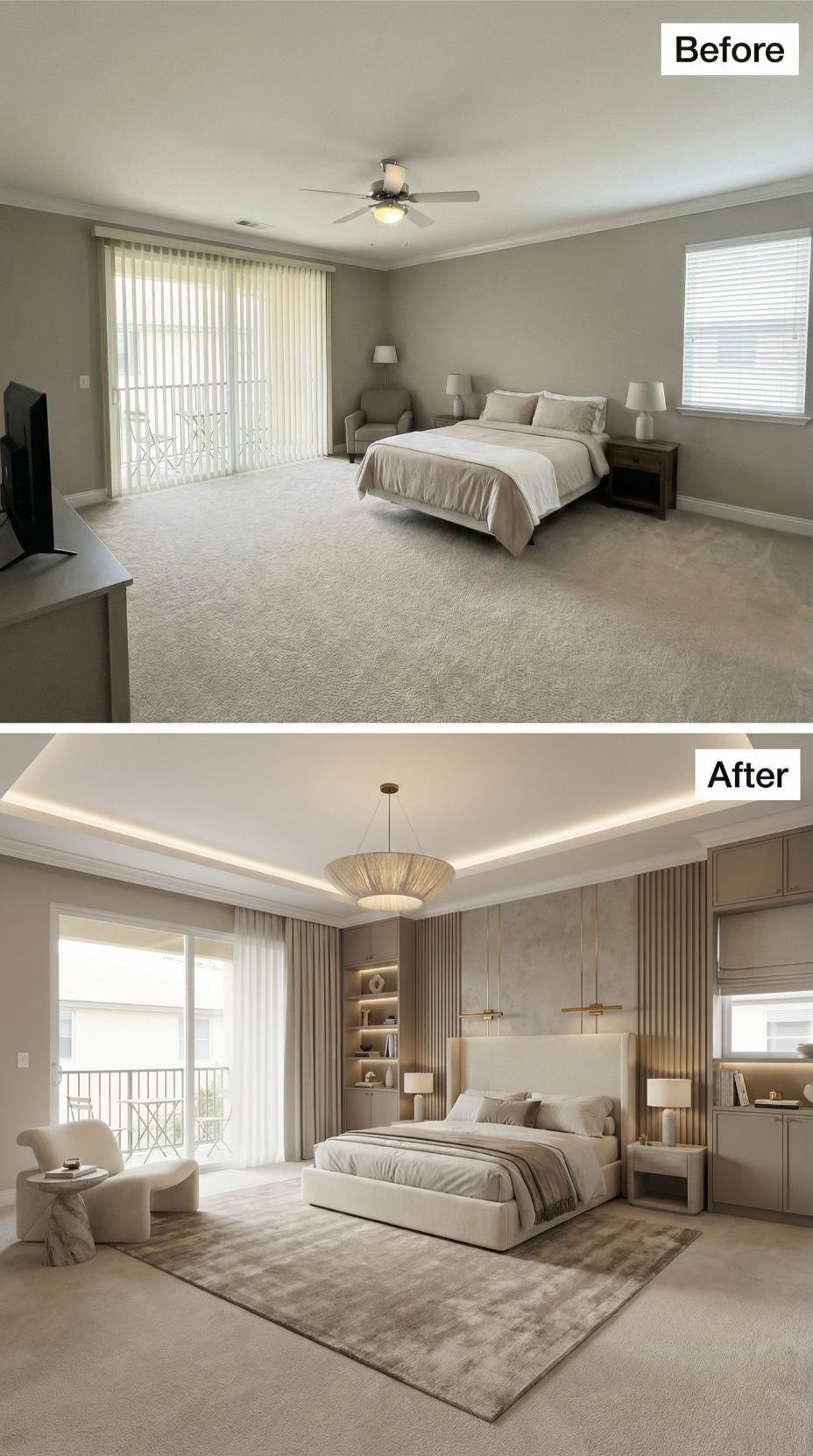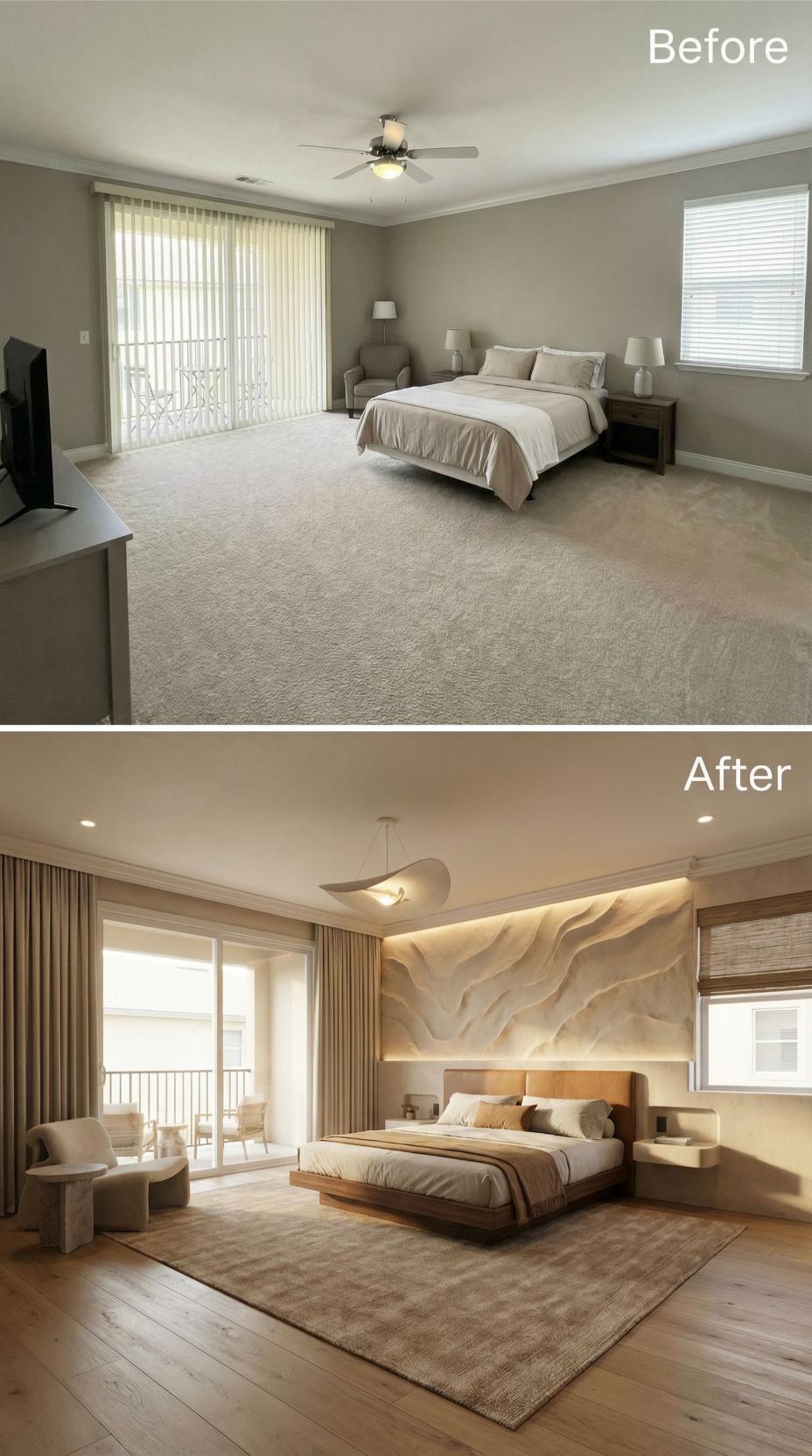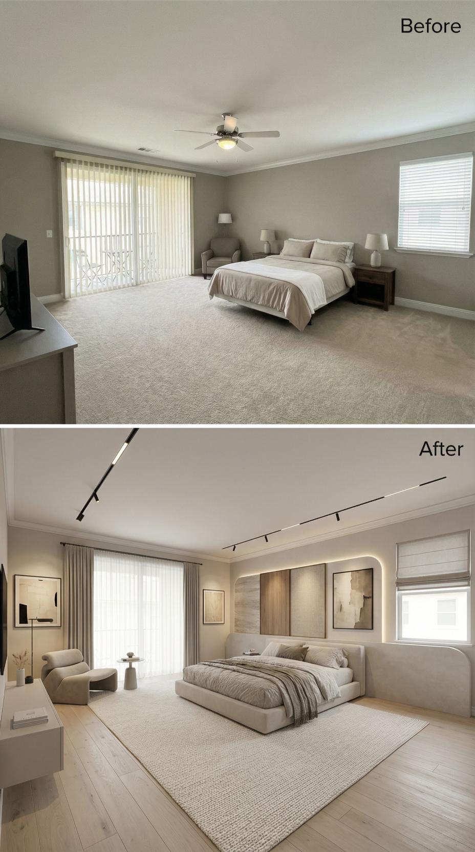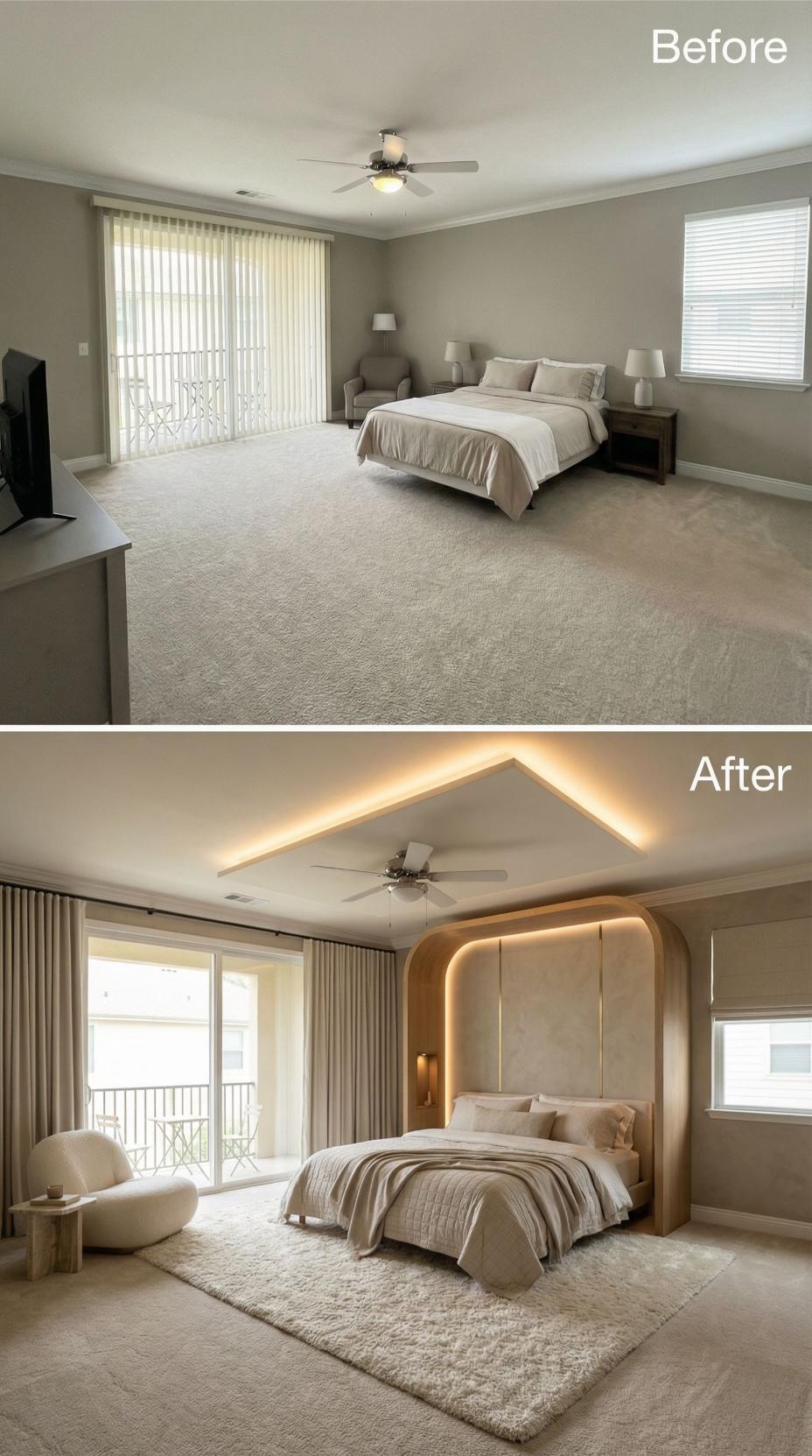 A main bedroom should feel like a landing pad, not a layover. This one arrives with the usual starter-kit calm: broad beige carpet, a ceiling fan doing its best, and furniture that politely refuses to argue with anything. Then the renovations move in. Across this gallery, the same footprint gets treated like prime real estate: bolder lighting, richer materials, smarter layouts, and headboards that behave like architecture. Welcome home.