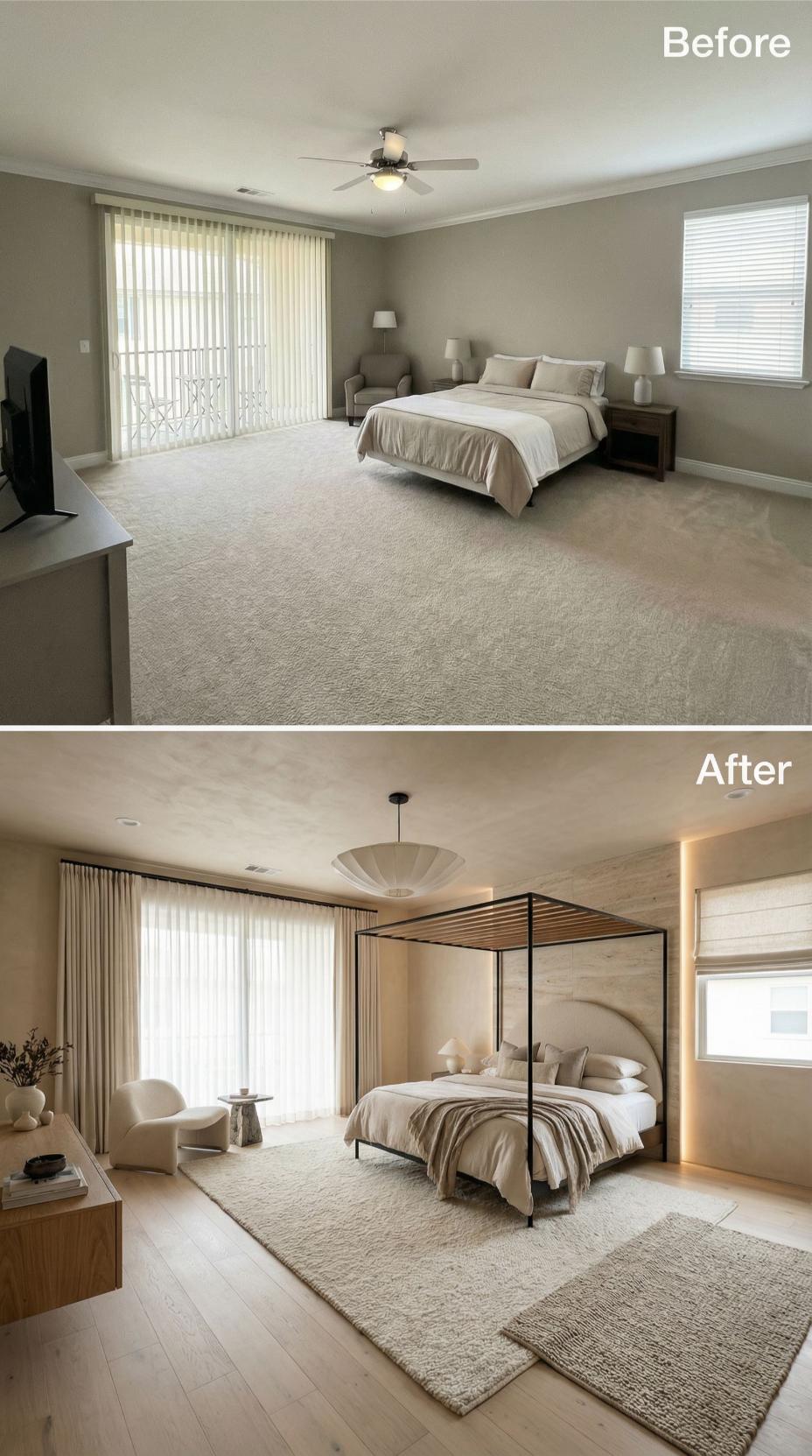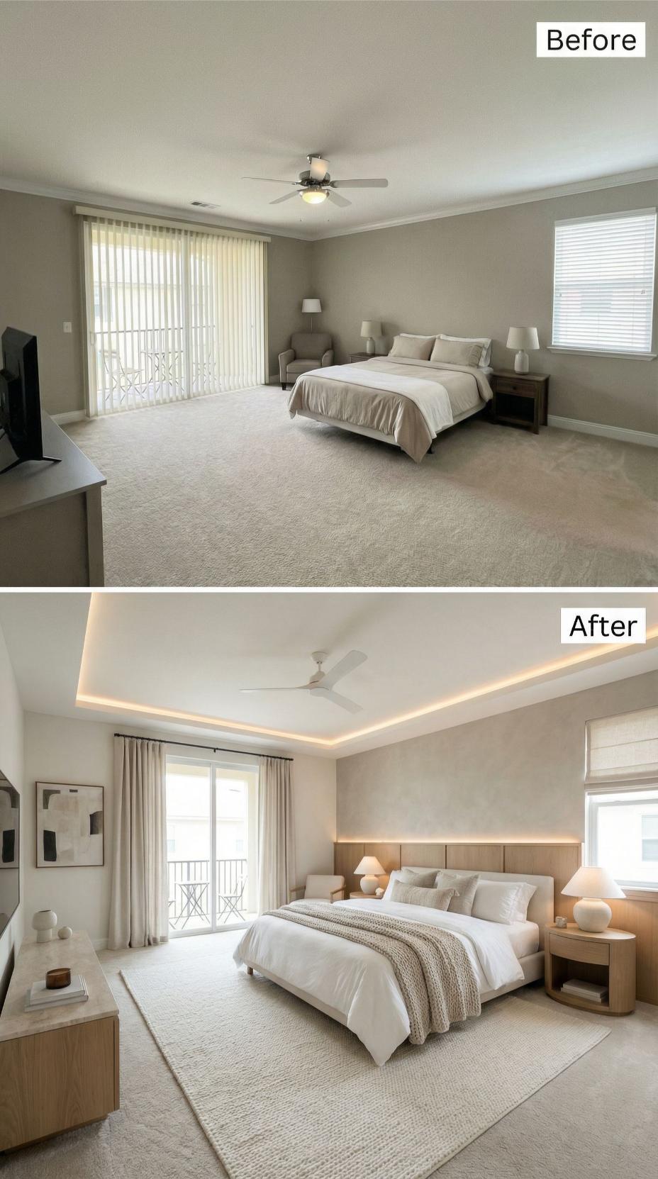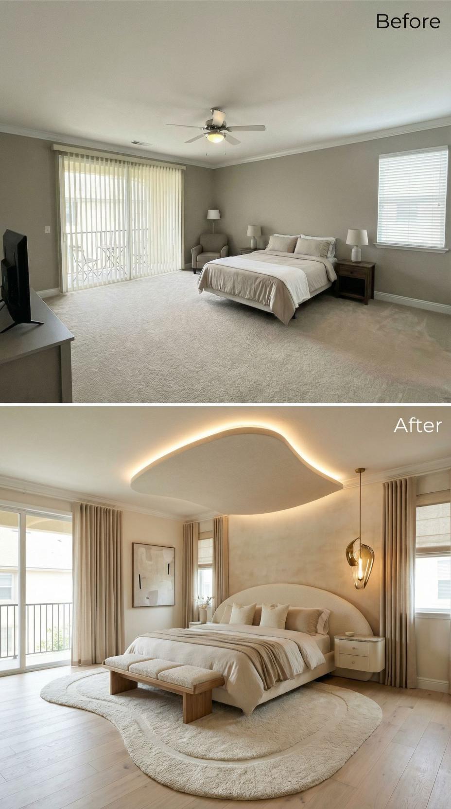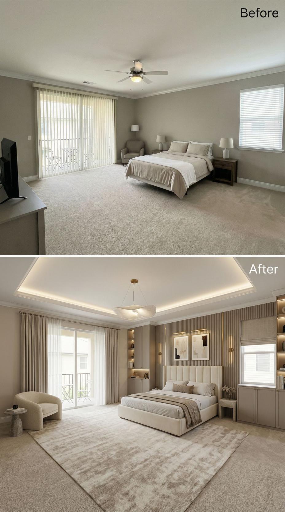 A main bedroom should feel like a landing pad, not a layover. This one arrives with the usual starter-kit calm: broad beige carpet, a ceiling fan doing its best, and furniture that politely refuses to argue with anything. Then the renovations move in. Across this gallery, the same footprint gets treated like prime real estate: bolder lighting, richer materials, smarter layouts, and headboards that behave like architecture. Welcome home.
