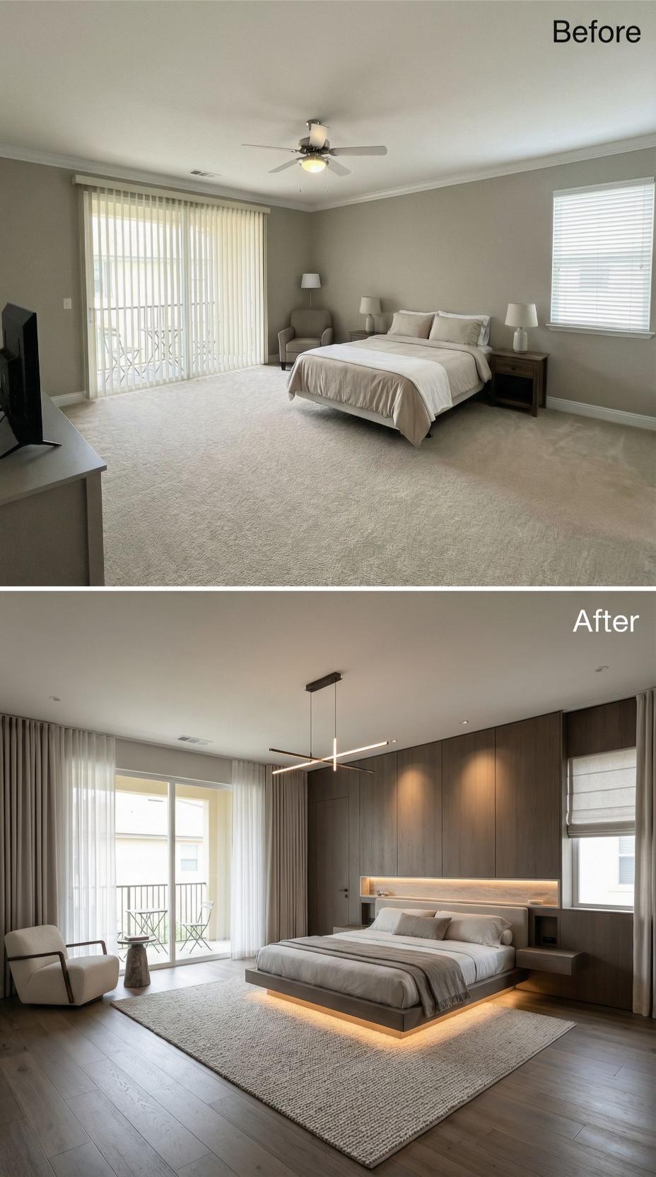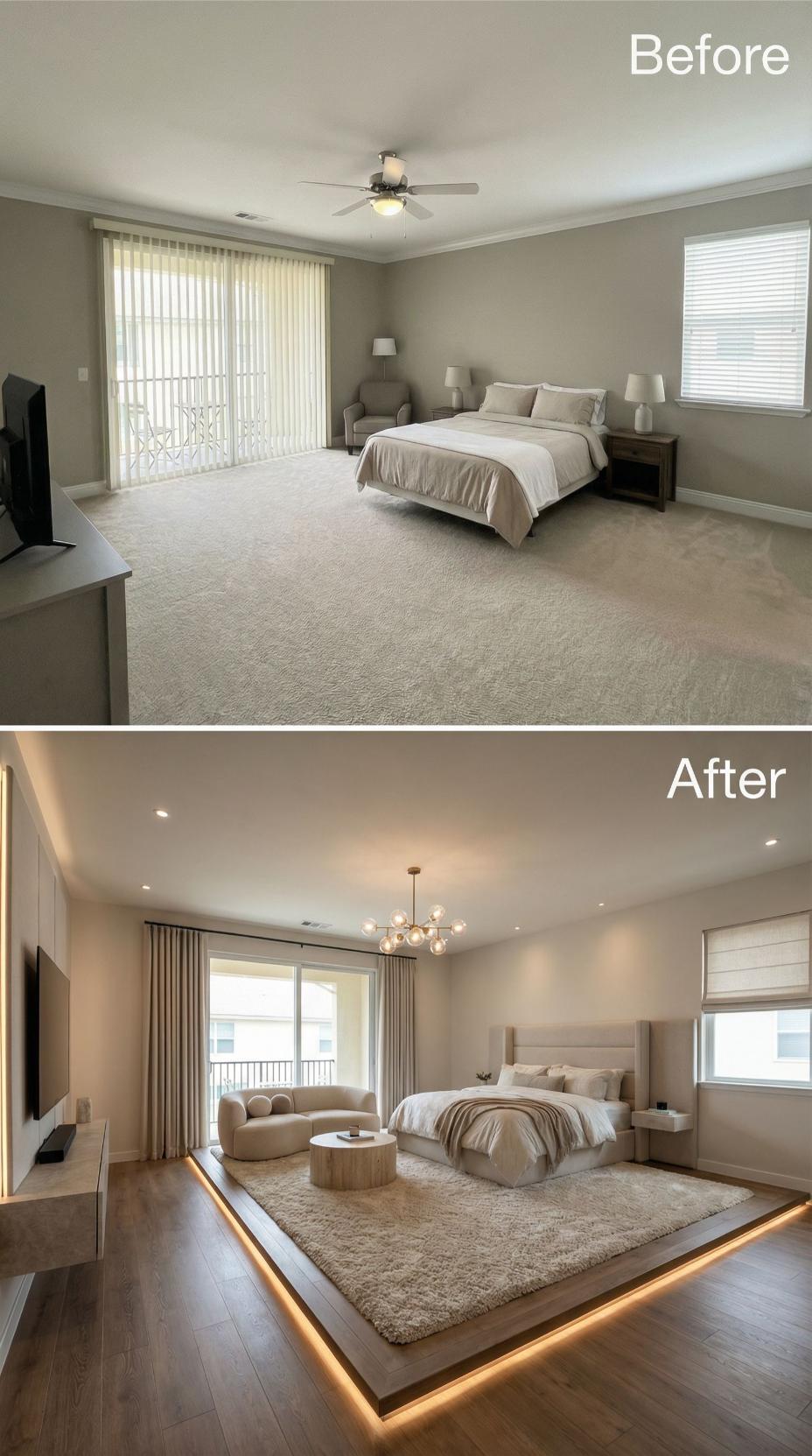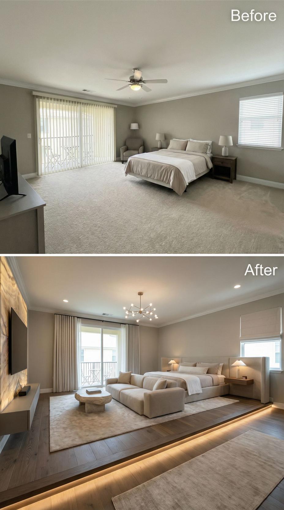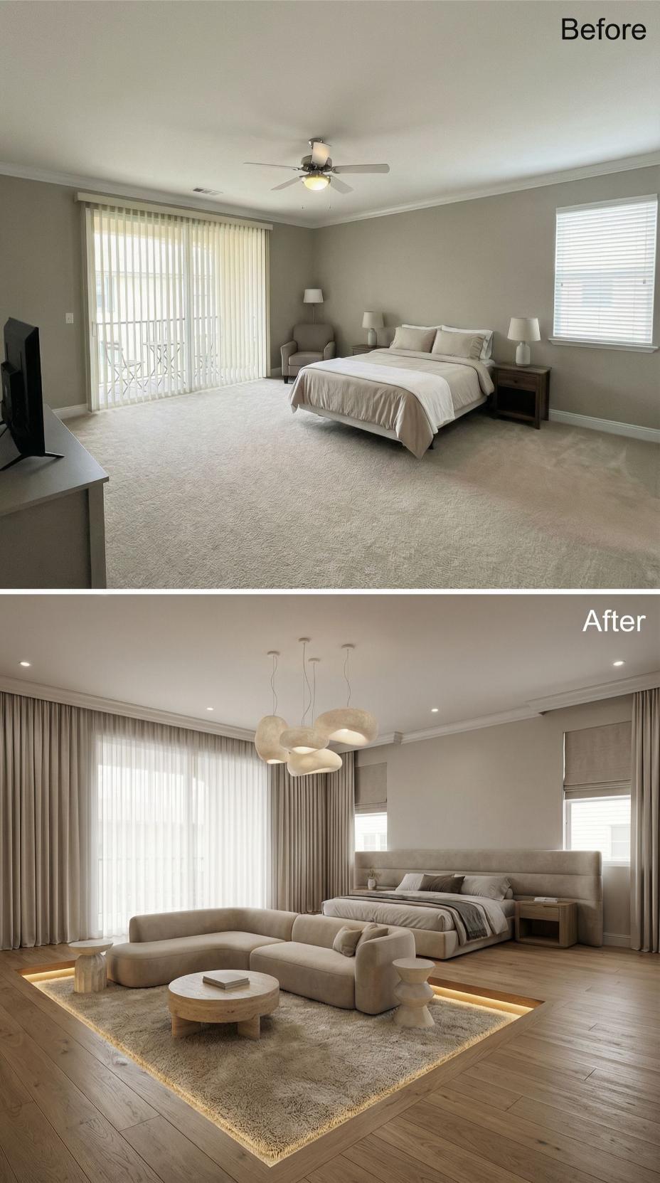 Dramatic under-bed lighting transforms this once-basic builder grade bedroom into a sophisticated retreat. Rich hardwood flooring replaces bland carpet while sleek panel curtains upgrade the standard vertical blinds. Modern geometric chandeliers, floating nightstands, and a plush sectional create an elevated hotel-like atmosphere that maximizes both style and functionality in the renovated space.