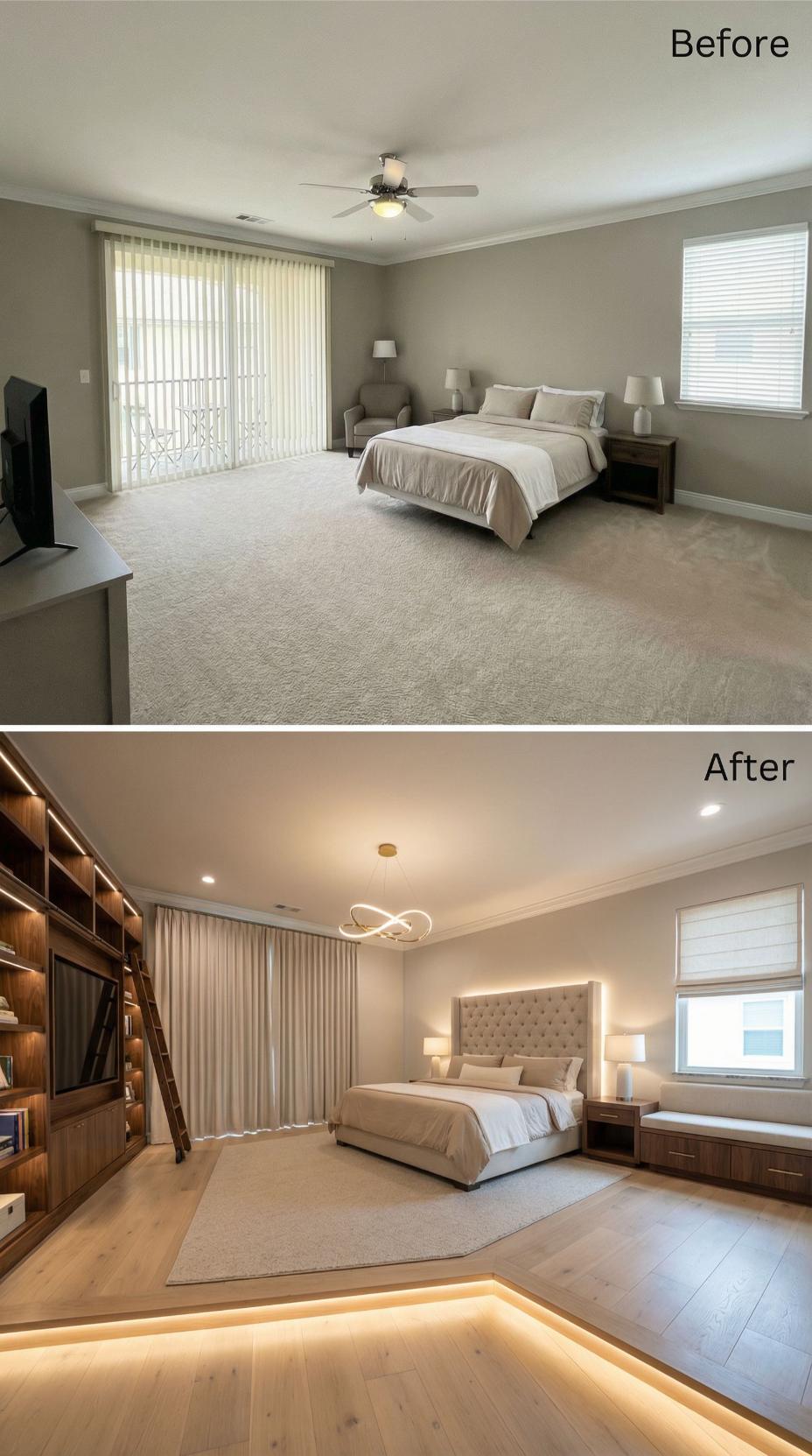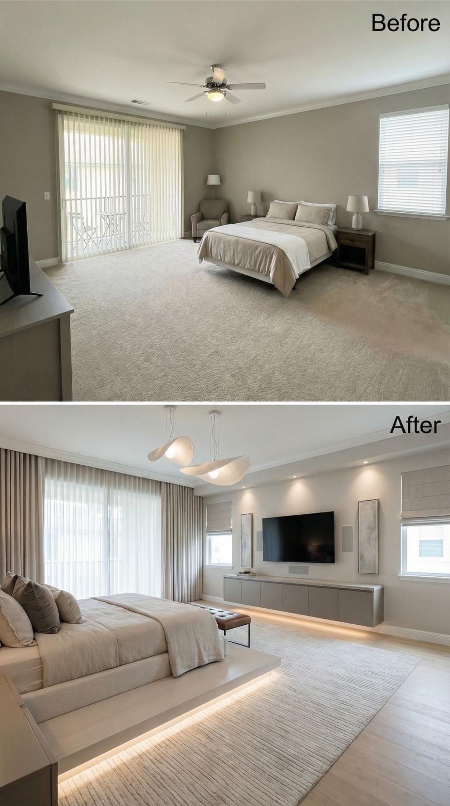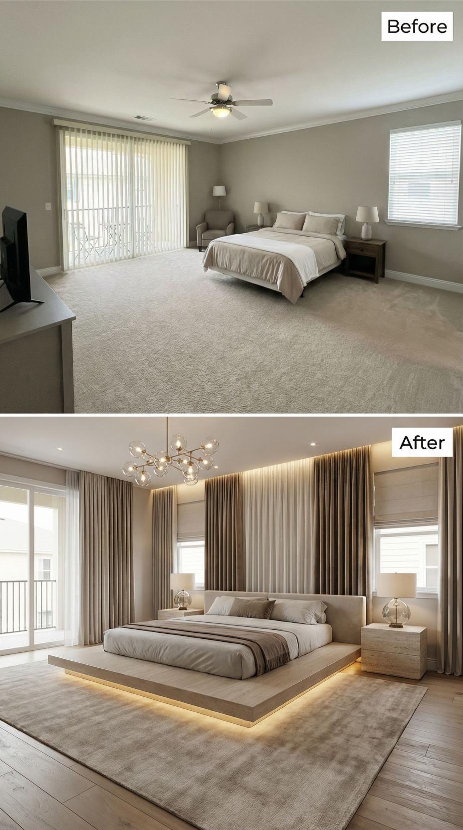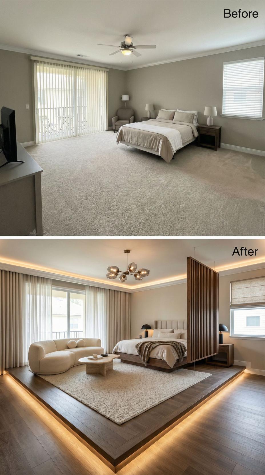 Dramatic under-bed lighting transforms this once-basic builder grade bedroom into a sophisticated retreat. Rich hardwood flooring replaces bland carpet while sleek panel curtains upgrade the standard vertical blinds. Modern geometric chandeliers, floating nightstands, and a plush sectional create an elevated hotel-like atmosphere that maximizes both style and functionality in the renovated space.