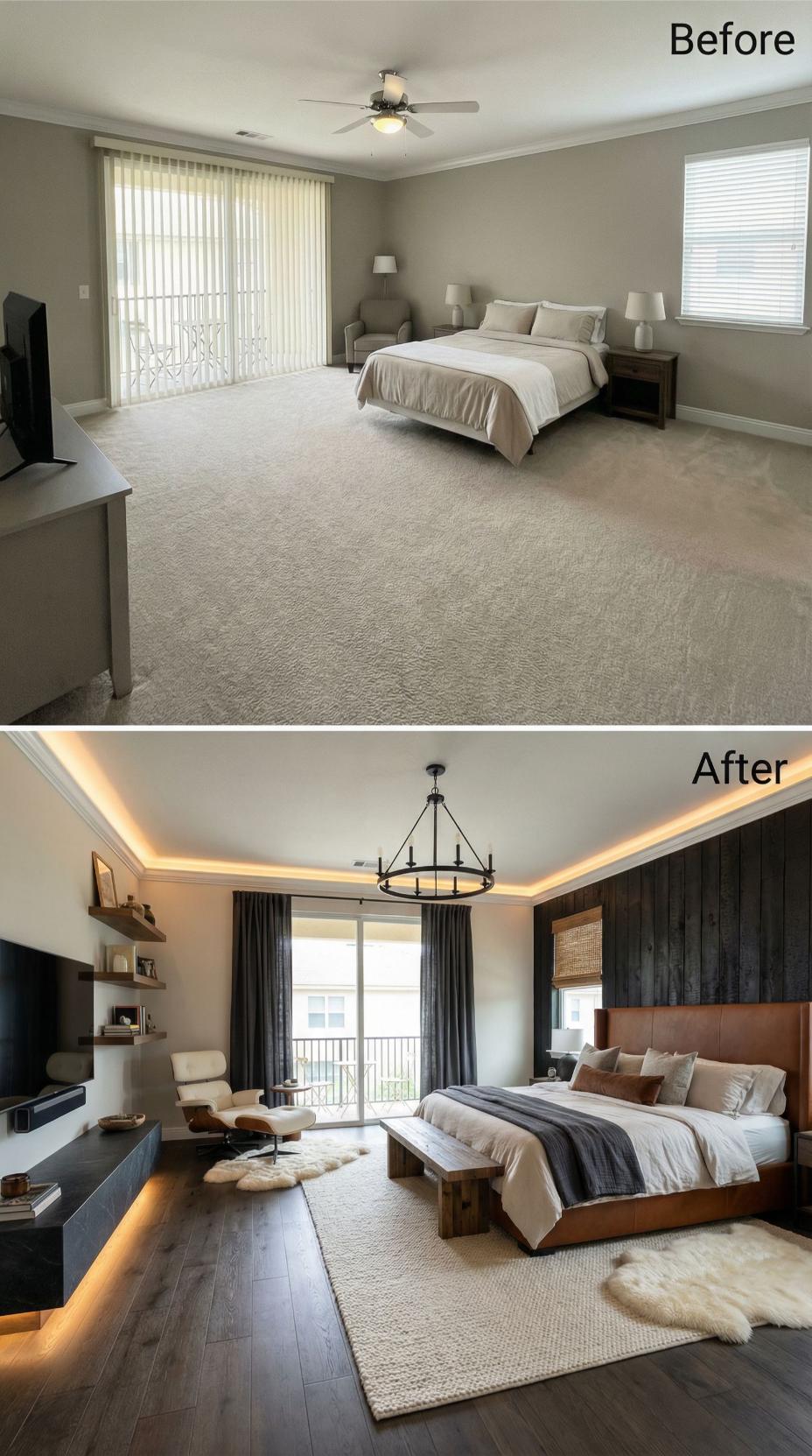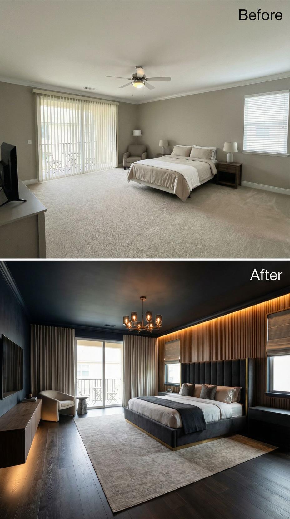 Dramatic transformation elevates this builder grade bedroom into a sophisticated retreat through rich charcoal walls and warm wood paneling. The original basic ceiling fan gives way to an elegant chandelier, while LED strip lighting creates ambient warmth behind the custom headboard wall. Luxurious dark hardwood flooring replaces generic carpet, and the neutral color palette shifts to bold, hotel-inspired tones throughout.