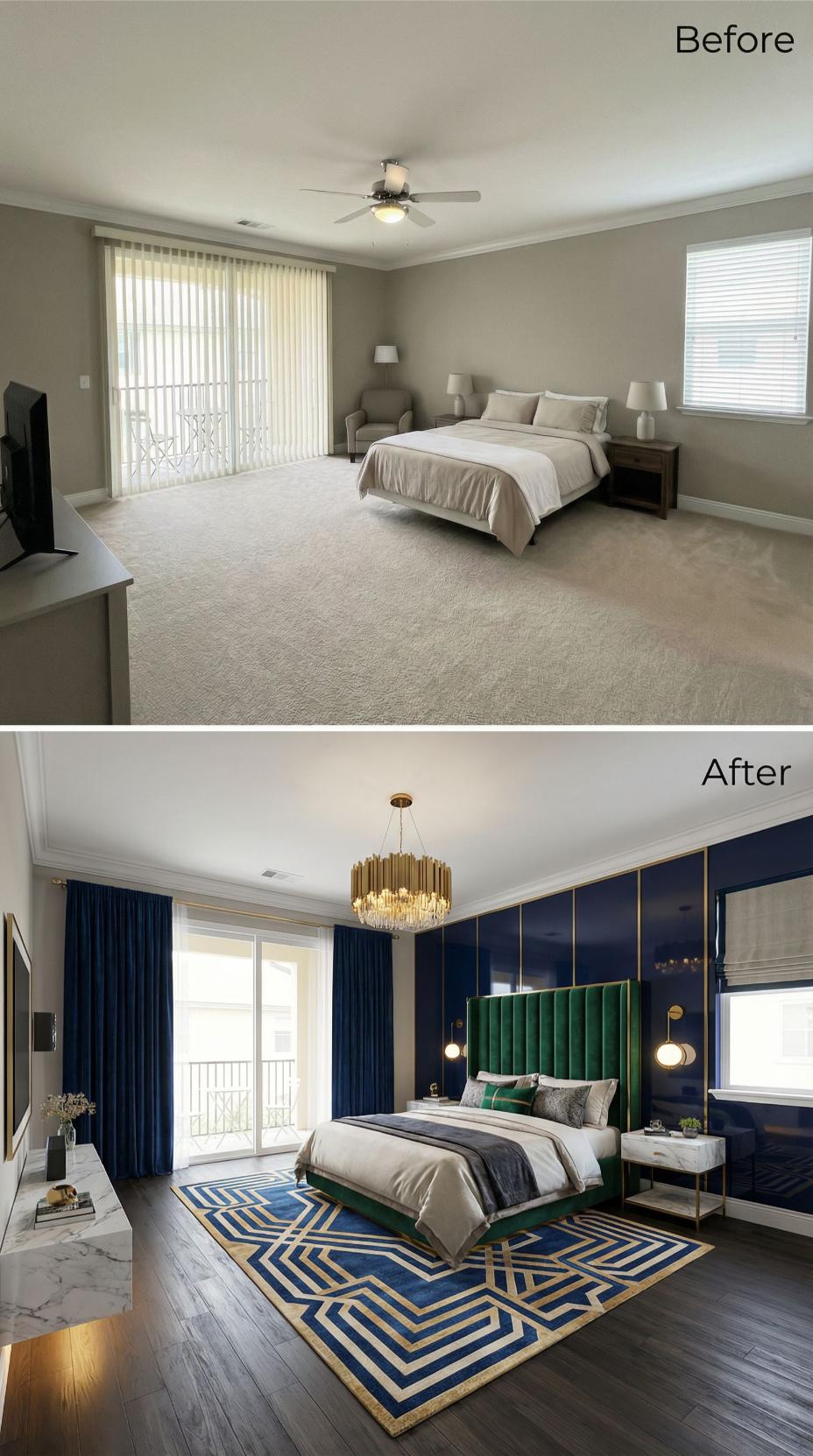 Dramatic navy blue paneled walls replace bland beige paint in this stunning bedroom transformation. The builder grade bedroom gains luxurious character through emerald velvet seating, a geometric navy and green area rug with gold accents, and a spectacular crystal chandelier. Rich curtains and metallic finishes elevate the space from cookie-cutter to custom sophistication.