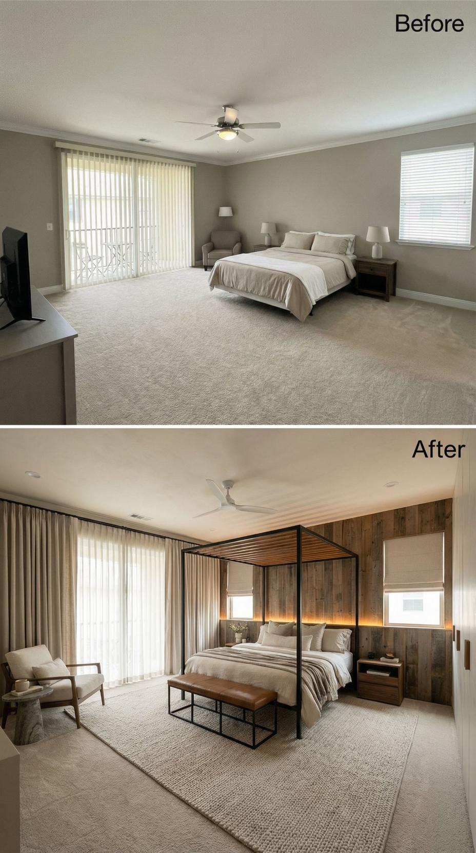 Wood paneling transforms this builder grade bedroom into a sophisticated retreat with natural warmth and contemporary elegance. The striking canopy bed anchors the space against a dramatic wood accent wall, while enhanced lighting creates ambient mood. Layered textiles and upgraded window treatments replace basic builder elements, establishing a cohesive design that balances modern minimalism with organic materials for ultimate relaxation.