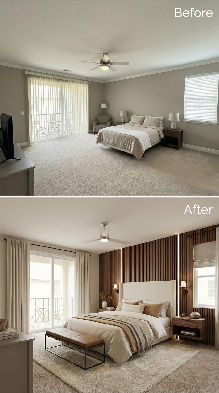Sophisticated design elements completely transformed this builder grade bedroom into an elegant sanctuary. Vertical wood slat paneling behind the bed creates stunning texture, while integrated shelving and warm LED lighting add both function and ambiance. A tufted cream headboard, modern chandelier, and layered neutral textiles elevate the space from standard to spectacular, proving how thoughtful upgrades can reimagine any ordinary bedroom.