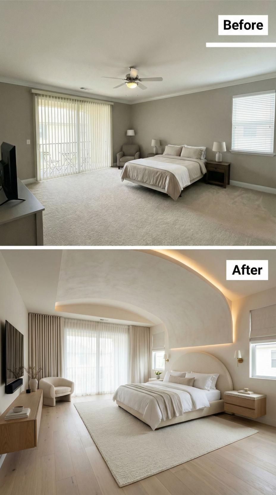 Dramatic curved ceiling elements with integrated LED lighting completely reimagine this builder grade bedroom into a sophisticated retreat. The custom headboard wall features flowing lines that mirror the ceiling’s architectural curves, while warm wood flooring replaces basic carpet. Floating nightstands and layered lighting create a hotel-like ambiance that elevates the entire space from standard to spectacular.