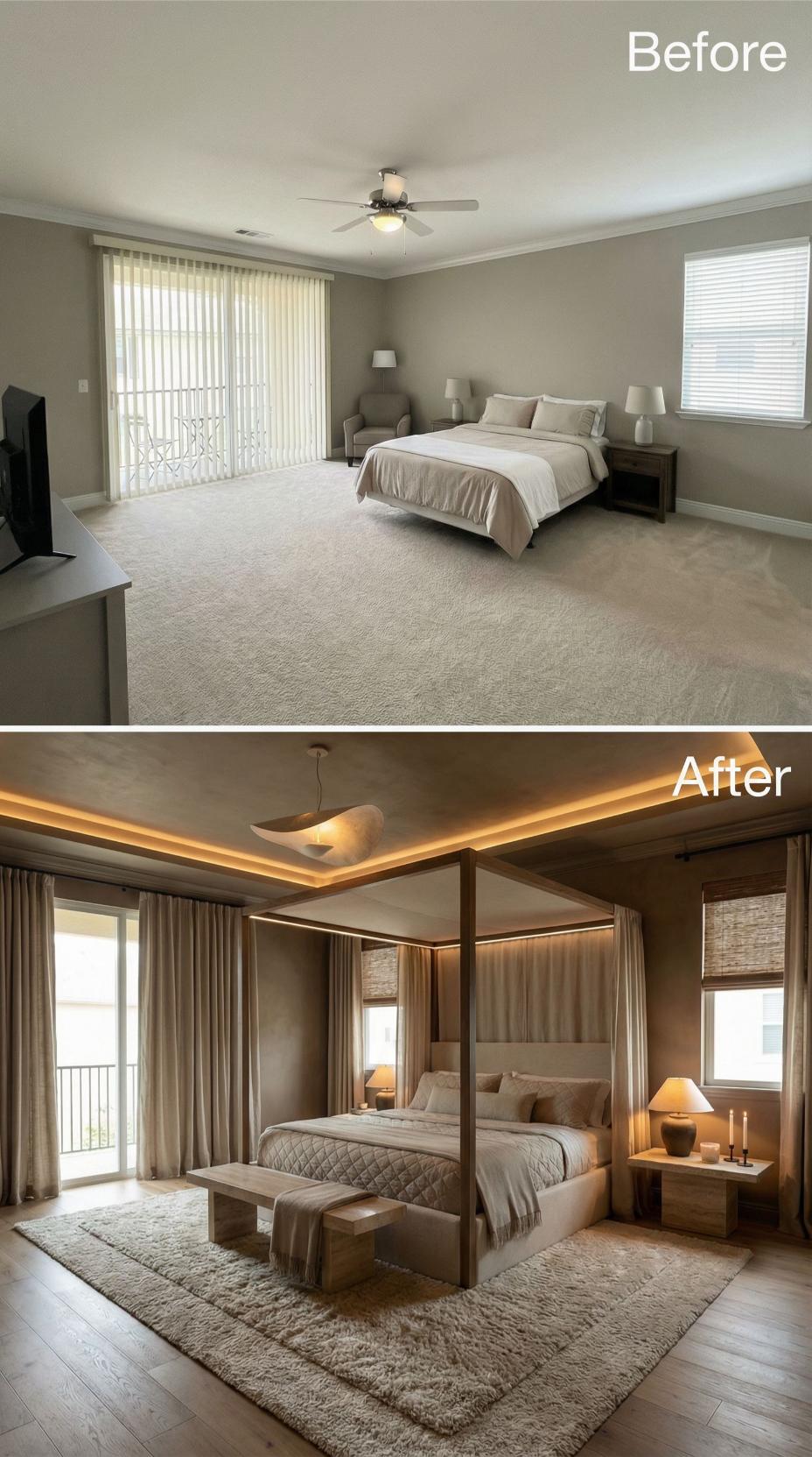 Dramatic architectural upgrades transformed this builder grade bedroom into a sophisticated retreat. Tray ceiling details with integrated LED strip lighting replace the basic flat ceiling, while a stunning four-poster canopy bed anchors the space. Natural stone accent walls, curved upholstered seating, and layered ambient lighting create an elevated hotel-like atmosphere that’s worlds apart from the original bland starter bedroom.