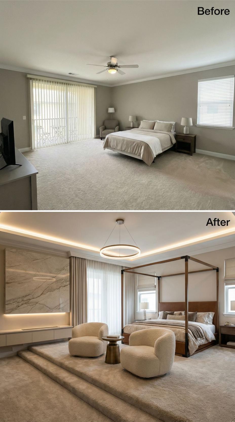 Dramatic architectural elements transform this builder grade bedroom into a sophisticated retreat. Rich marble bookmatched behind the bed creates stunning visual impact, while custom built-in storage maximizes functionality. Warm wood tones, integrated lighting, and flowing curtains elevate the space from basic to breathtaking. Strategic layering of textures and finishes delivers hotel-like luxury.