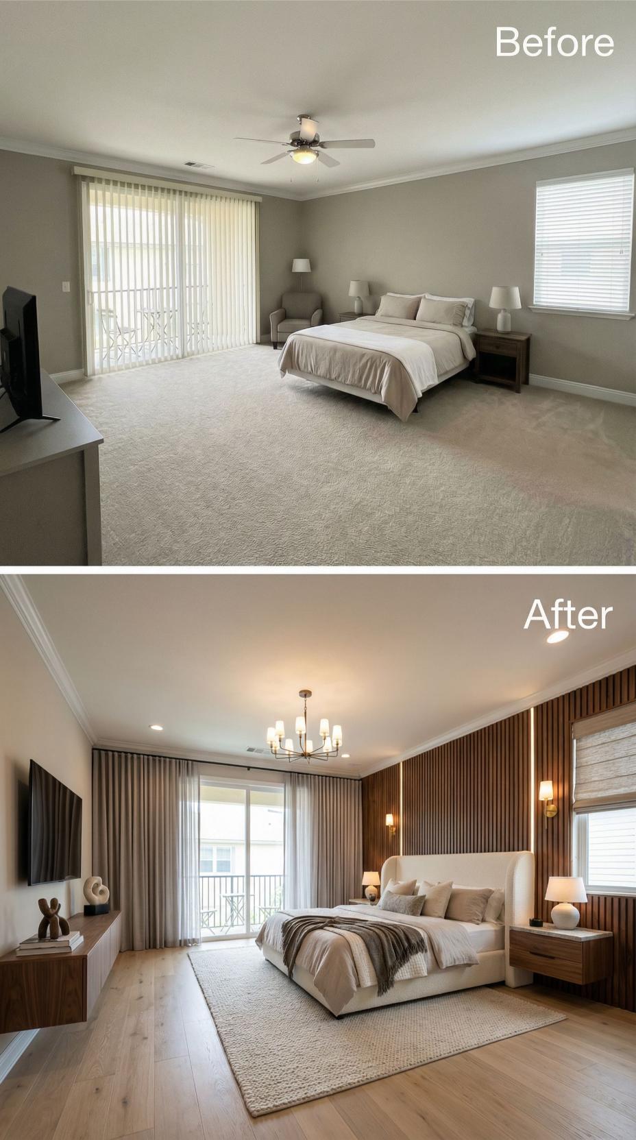Vertical wood slat paneling transforms the bland builder grade bedroom into a sophisticated sanctuary with rich walnut tones and architectural interest. The original ceiling fan gives way to a stunning brass chandelier, while flowing curtains replace basic blinds. Hardwood floors, integrated lighting, and floating nightstands complete this luxurious transformation that elevates every surface.