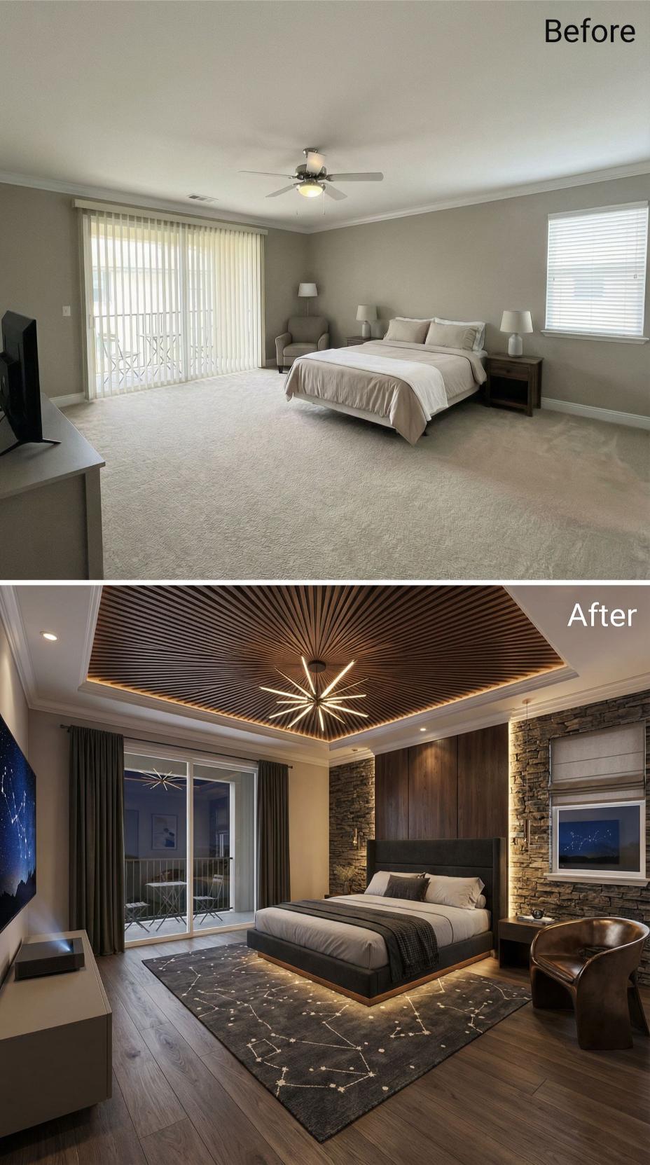 Dramatic ceiling architecture transforms this builder grade bedroom into a celestial retreat. Rich walnut wood paneling creates a sophisticated backdrop behind the platform bed, while the geometric tray ceiling features stunning radial wood slats with integrated LED lighting. Stone accent walls, dark hardwood floors, and a constellation-patterned area rug complete this luxurious transformation from bland beige walls and basic carpeting.