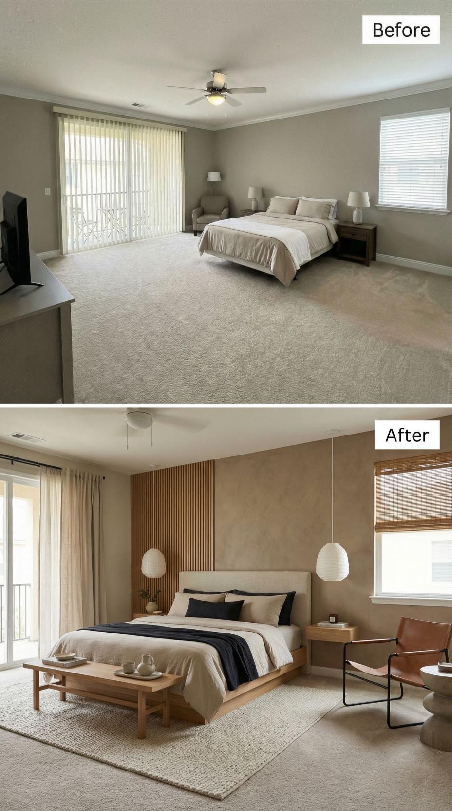 Vertical wood slat paneling transforms the builder grade bedroom’s plain walls into a striking focal point behind the upholstered platform bed. Pendant lighting replaces the basic ceiling fan, while natural bamboo blinds and flowing curtains elevate the window treatments. Warm wood furniture, including a sleek bench and leather accent chairs, creates an inviting lounge area that completely reimagines this once-generic space.