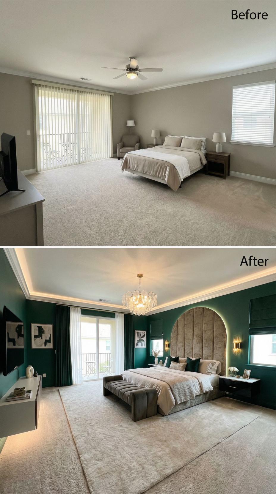 Bold emerald green walls replace bland beige to create this stunning transformation from a basic builder grade bedroom. The dramatic makeover features an oversized curved velvet headboard, sophisticated tray ceiling with ambient lighting, and rich forest green drapery. Wall sconces and a crystal chandelier elevate the lighting design while curated artwork adds personality to this luxurious retreat.