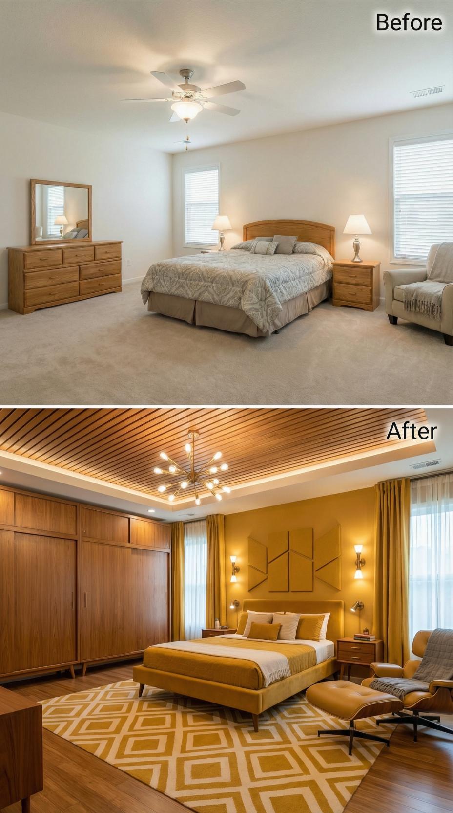 Warm mustard walls and a striking wood-slat ceiling transformed this generic builder-grade bedroom into a sophisticated retreat. The geometric area rug anchors the space while built-in walnut cabinetry replaces basic furniture, maximizing storage without clutter. A modern chandelier and coordinated wall sconces create layered lighting that soothes anxious minds, while the rich color palette promotes restful sleep.