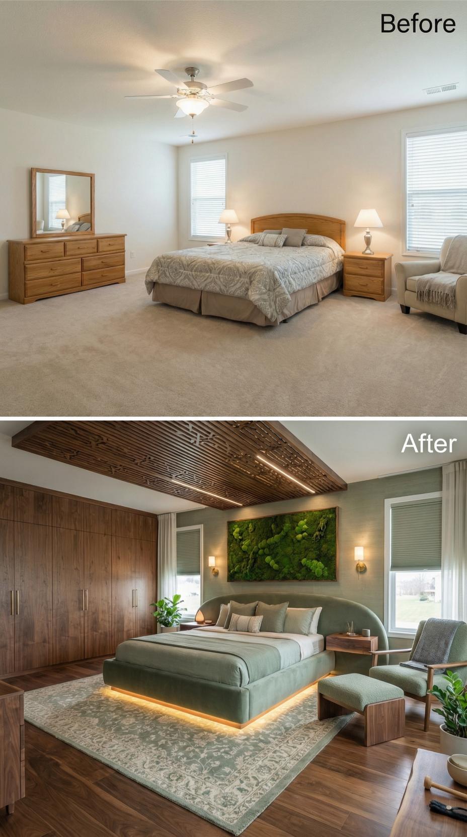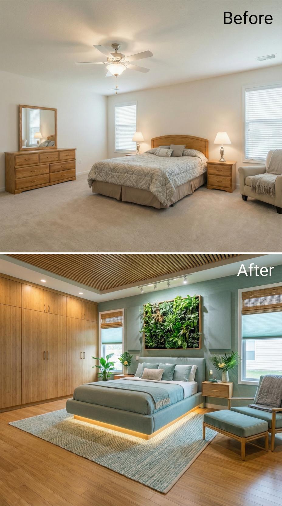Dramatic transformation elevates this builder-grade bedroom for anxious people into a calming retreat through sage green walls, warm wood flooring, and a stunning living plant wall. Under-bed lighting creates a floating effect while built-in wardrobes maximize storage. Track lighting and natural textures replace the basic ceiling fan setup, establishing a spa-like atmosphere perfect for stress relief.