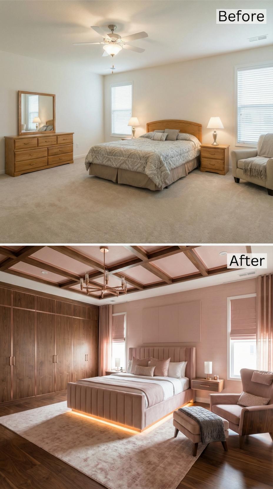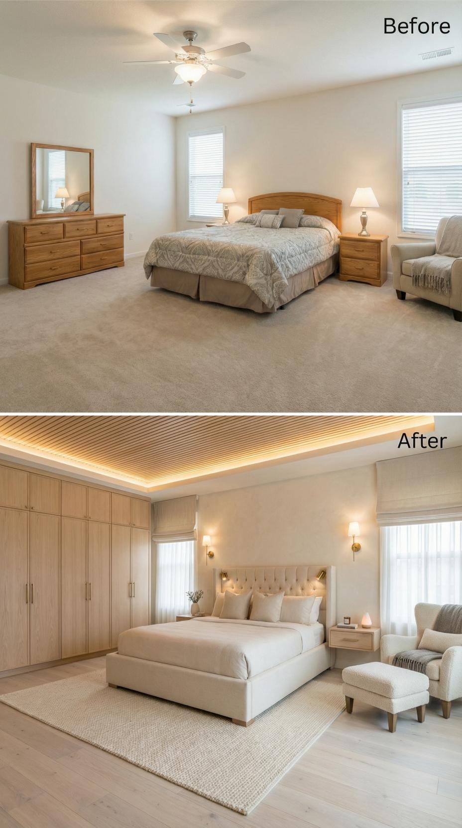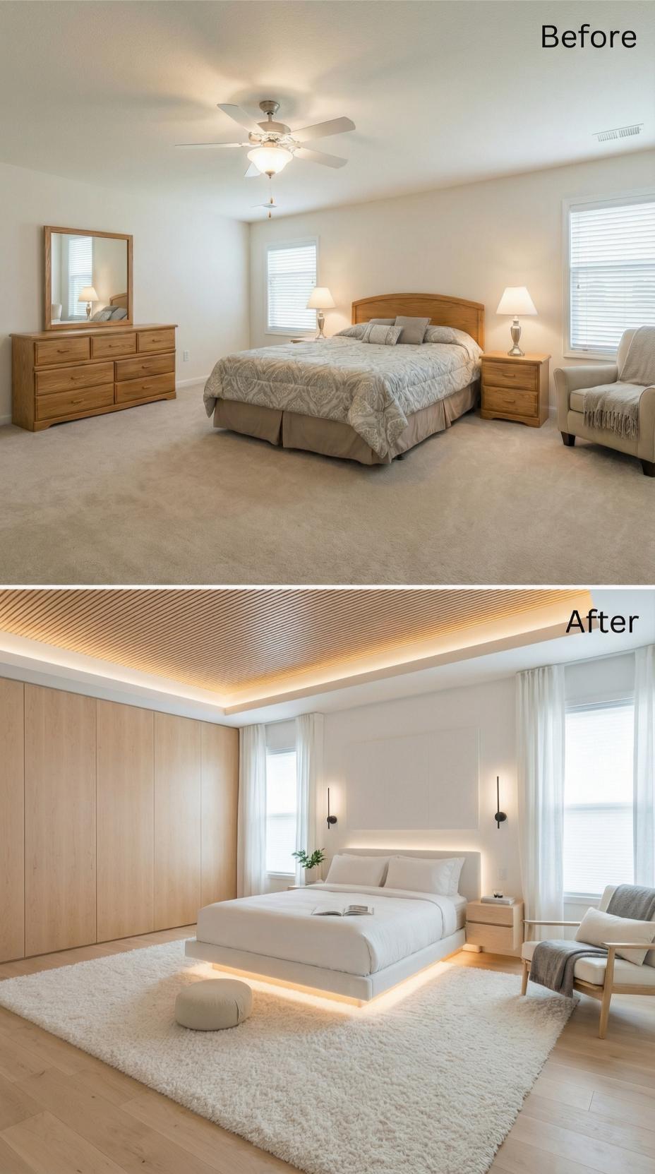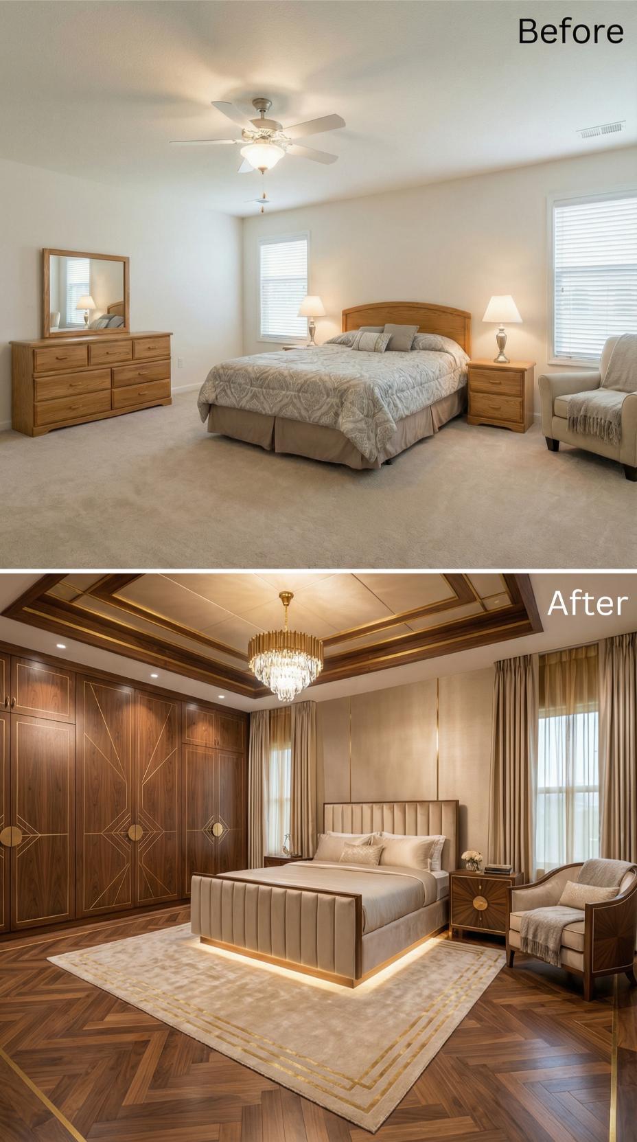 Warm wood paneling replaces bland beige walls while a stunning floating bed platform with integrated LED lighting creates a dramatic focal point. The builder-grade bedroom’s traditional furniture arrangement gives way to a sophisticated wood-wrapped storage wall and sleek built-ins. A striking geometric wood ceiling treatment adds architectural interest, while ambient under-bed lighting and a plush area rug over rich hardwood flooring complete this serene, hotel-inspired transformation.