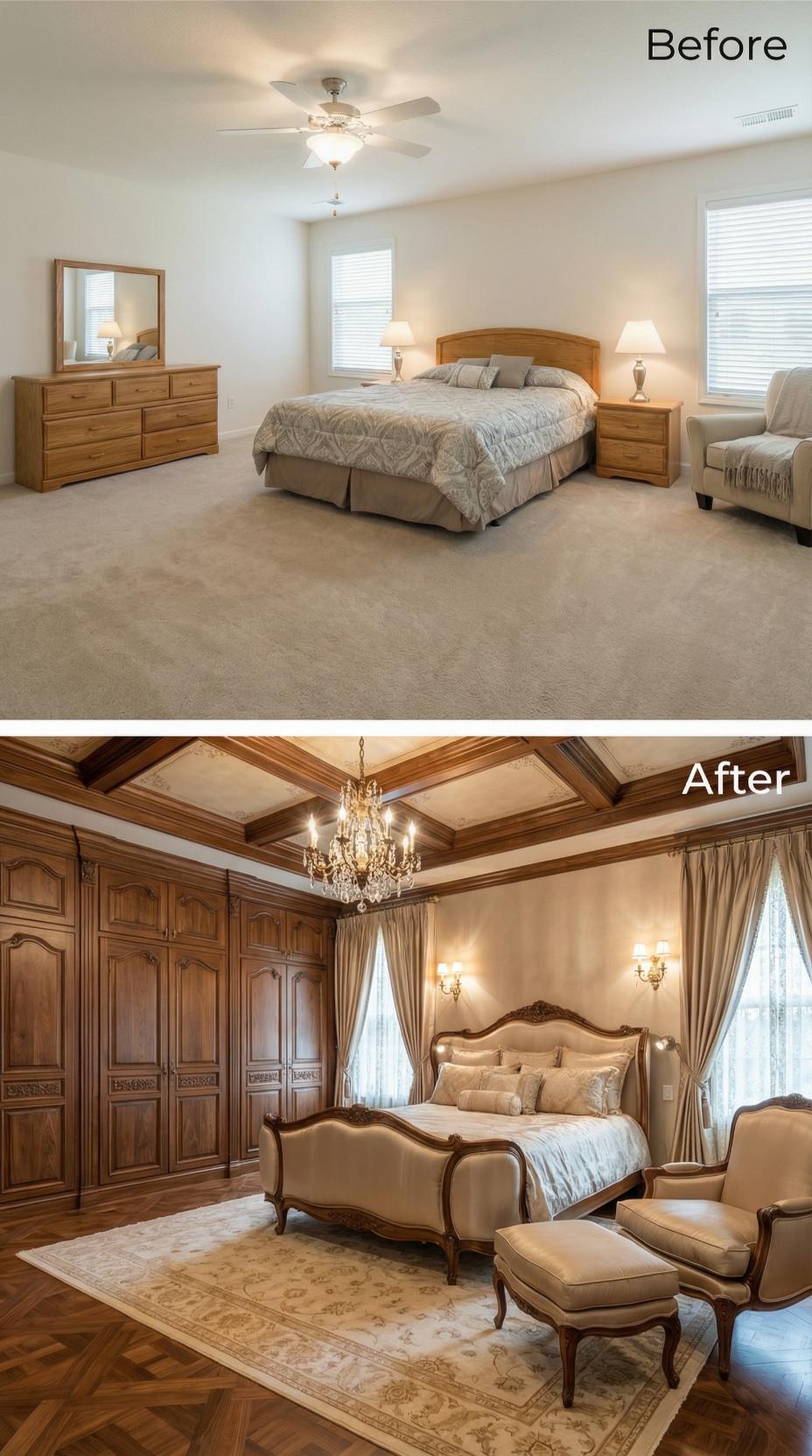 Rich walnut paneling transforms this once-sterile builder-grade bedroom into an opulent retreat that soothes anxious minds. Ornate coffered ceilings replace basic drywall, while a crystal chandelier elevates the lighting from harsh overhead fan to romantic ambiance. Floor-to-ceiling custom millwork provides ample storage, eliminating clutter that triggers stress. The French-inspired bed frame and sumptuous drapery create intimate boundaries in the expansive space.