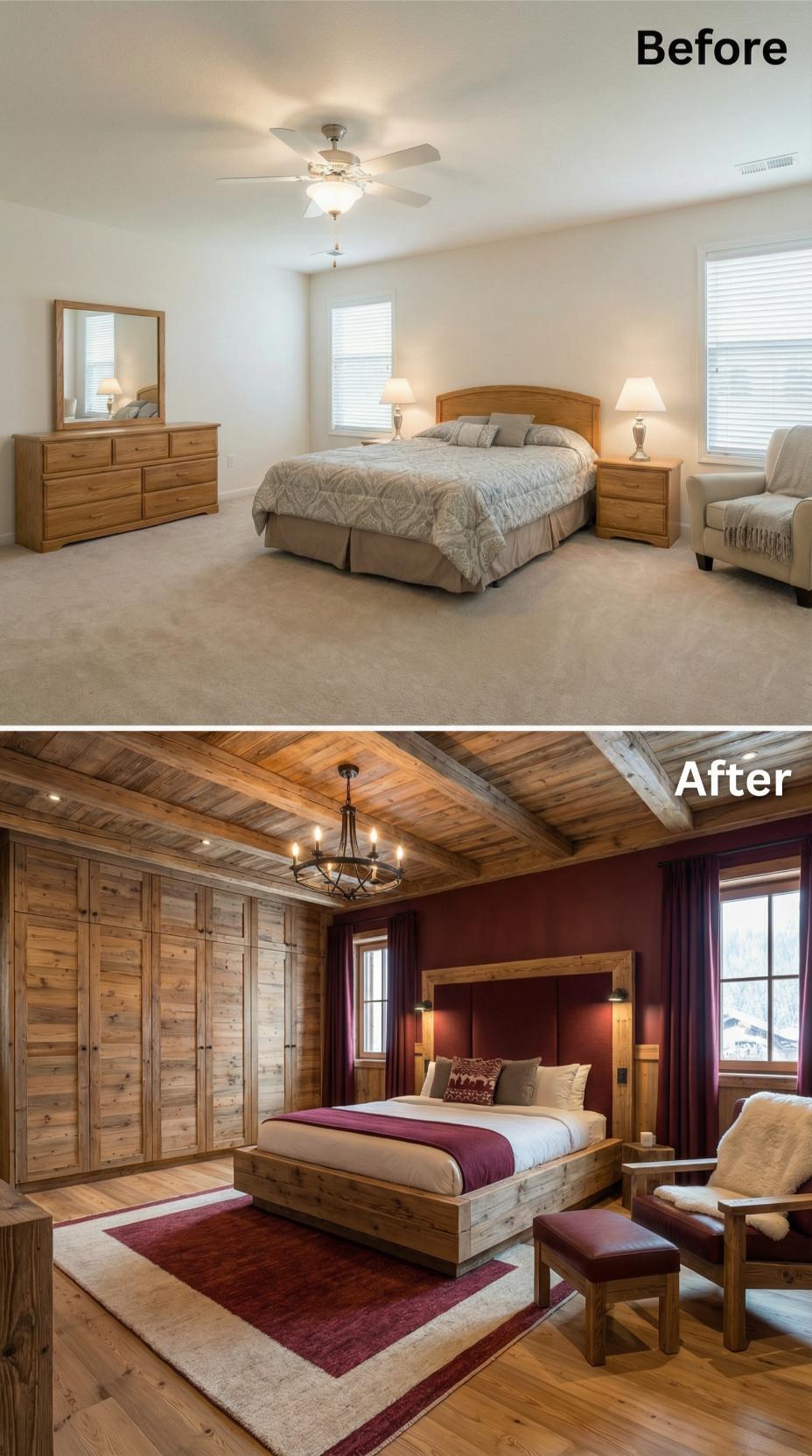 Rich burgundy walls and exposed wood beam ceilings completely reimagine this once-bland builder-grade bedroom for anxious people. Custom reclaimed wood built-ins replace basic furniture while a stunning chandelier upgrades the standard ceiling fan. Warm hardwood floors, natural wood paneling, and deep jewel tones create an enveloping sanctuary that promotes rest and relaxation through organic textures and sophisticated mountain lodge styling.