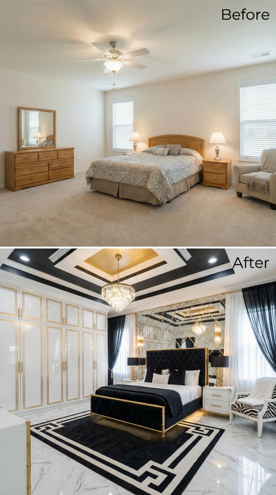 Bold geometric patterns and metallic gold accents transformed this builder-grade bedroom for anxious people into a sophisticated retreat. The dramatic black and white color scheme creates visual interest through coffered ceilings, geometric wallpaper, and a striking area rug. Crystal chandeliers and built-in wardrobes with gold trim elevate the space from basic beige walls and standard furniture to a hotel-inspired sanctuary that promotes calm through structured elegance.