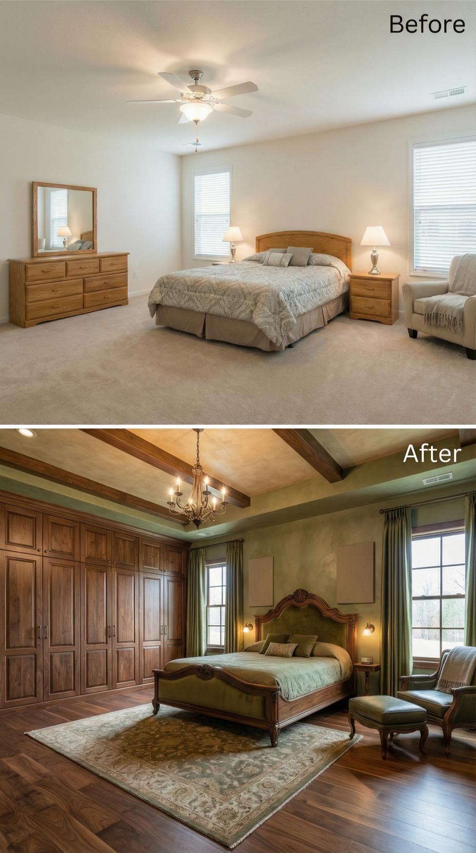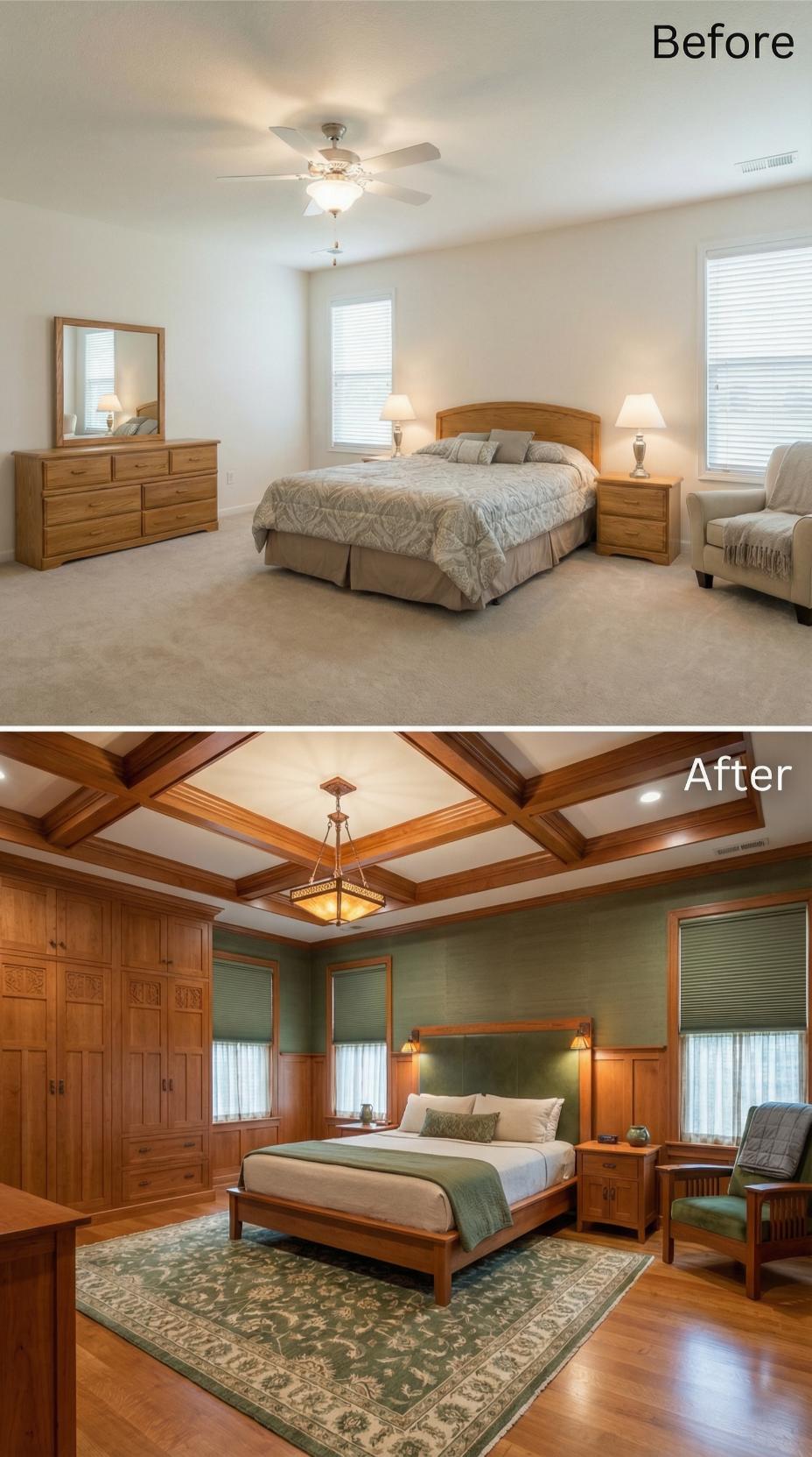 Rich wood coffered ceilings replace the plain white ceiling, instantly elevating this builder-grade bedroom for anxious people into a sophisticated retreat. Custom built-in wardrobes with intricate paneling provide organized storage while warm hardwood floors anchor the space. The calming sage green accent wall creates a soothing backdrop, complemented by matching window treatments and upholstery that promote restful sleep.