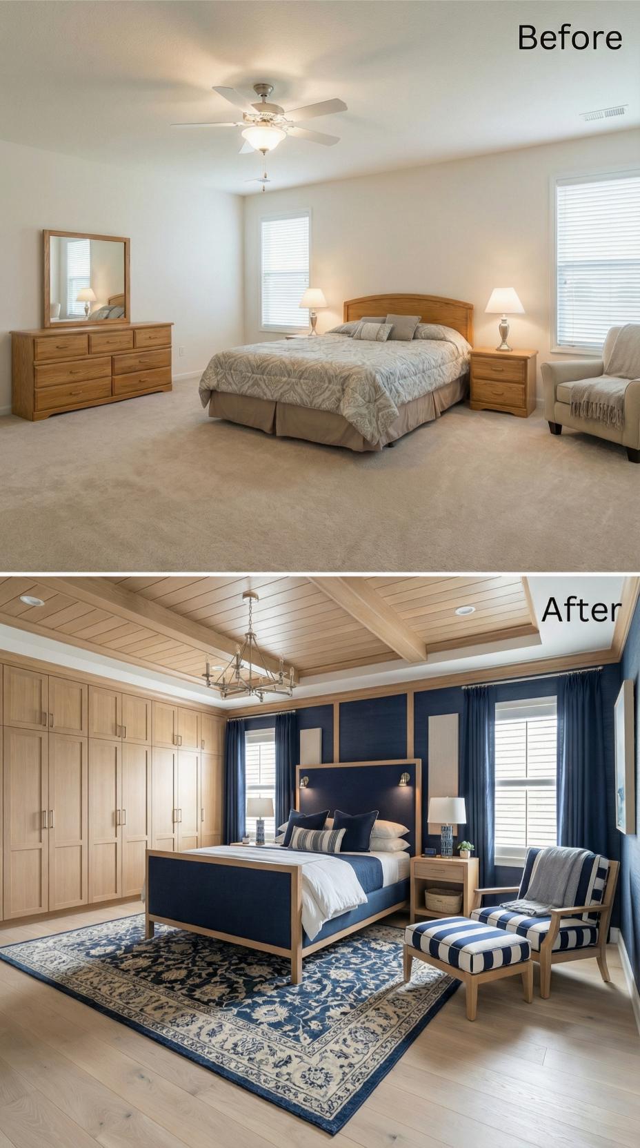 Rich navy blue accent walls and custom wood paneling completely reimagine this builder-grade bedroom for anxious people. Floor-to-ceiling built-in wardrobes maximize storage while eliminating clutter-induced stress. The coffered wood ceiling adds architectural interest above, while brass sconces provide targeted reading light. Striped navy curtains frame the windows, creating a cocoon-like sanctuary that promotes restful sleep and calm energy.